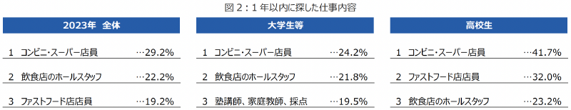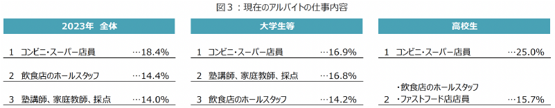 また、コロナ禍で大きな影響を受けた飲食店のホールスタッフは、現在のアルバイトでは全体で2番目、大学生等に限ると、塾講師などに次いで3番目という結果でした。