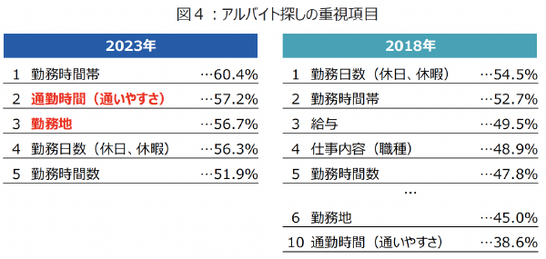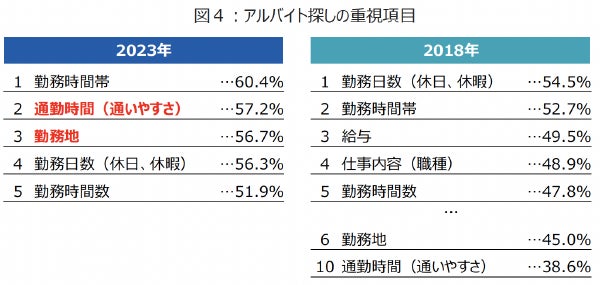 理由として、2018年は、1年以内にアルバイト探しをしていないが、アルバイトをしていた(それ以前に始めたアルバイトを続けている)学生が47.9%いたのに対し、2023年は14.2%に留まったことが考えられます。コロナ禍でアルバイトを控えていた状況から、この1年でアルバイト探しをする学生が増えた可能性がありそうです。