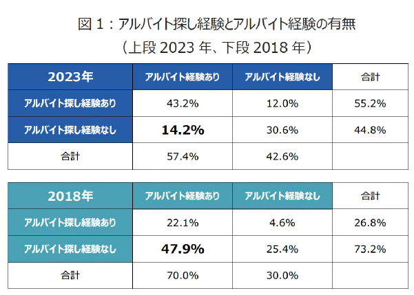 学生アルバイトはどう変わったのか、2018・2023年比較 「1年以内のアルバイト探し経験あり」が26.8%から55.2%大きく増加 「探した仕事」「現在の仕事」いずれもトップはコンビニ・スーパー店員