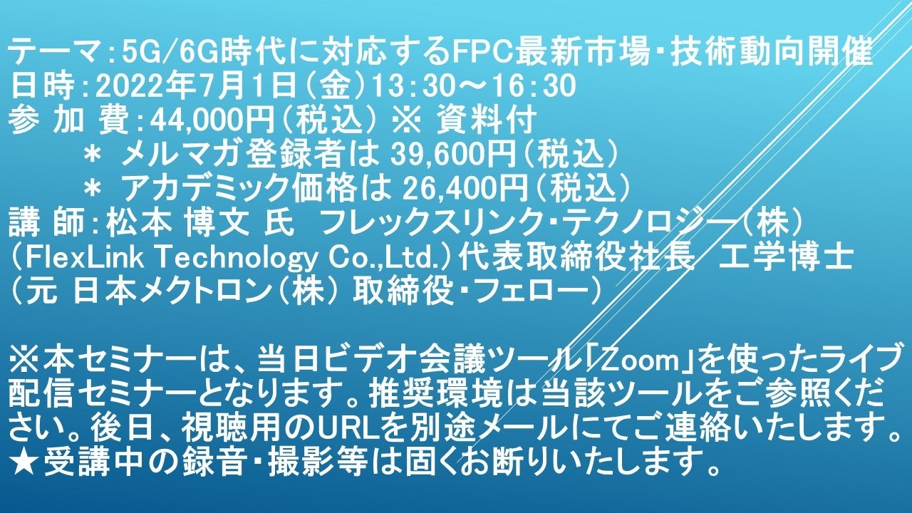 先端技術情報や市場情報を提供している(株)シーエムシー・リサーチ(千代田区神田錦町: https://cmcre.com/ )では、 各種材料・化学品などの市場動向・技術動向のセミナーや書籍発行を行っておりますが、 このたび「5G/6G時代に対応するFPC最新市場・技術動向」と題するセミナーを、 講師に松本 博文 氏 フレックスリンク・テクノロジー(株)(FlexLink Technology Co.,Ltd.)代表取締役社長 工学博士 (元 日本メクトロン(株) 取締役・フェロー))をお迎えし、2022年7月1日(金)13:30より、 ZOOMを利用したライブ配信で開催いたします。 受講料は、 一般:44,000円(税込)、 弊社メルマガ会員:39,600円(税込)、 アカデミック価格は26,400円(税込)となっております(資料付)。