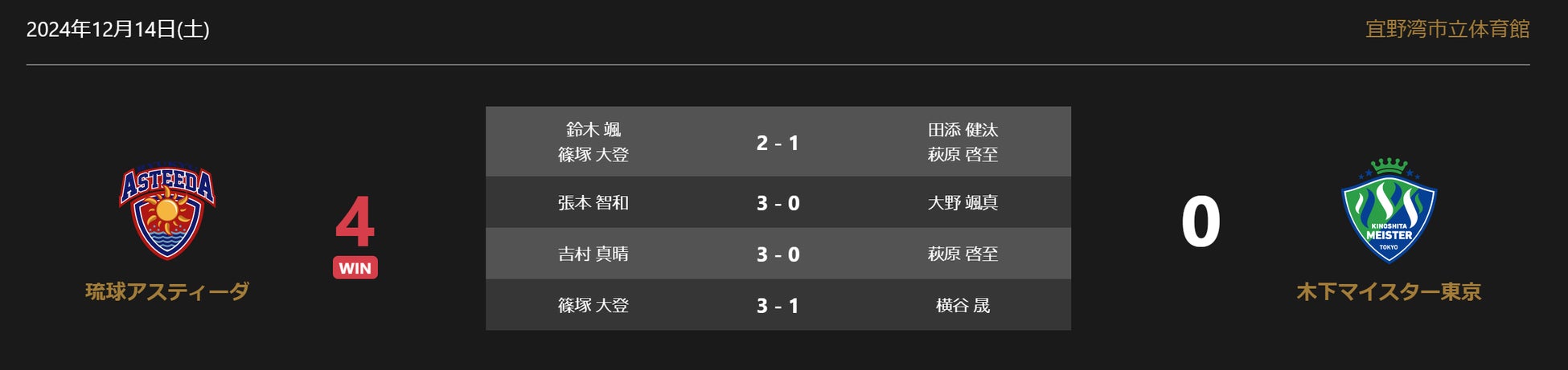 ノジマTリーグ 2024-2025シーズン 公式戦 12月14日開催 琉球アスティーダ vs 木下マイスター東京の試合は、4-0で琉球アスティーダが勝利しました。
