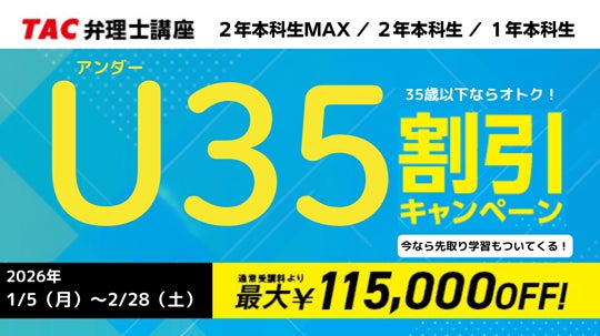 2027年・2028年の合格を目指す35歳以下の方限定で、最大115,000円割引でお申込みいただけます。年間を通じて一番お得なこの機会に、ぜひお申込みください。