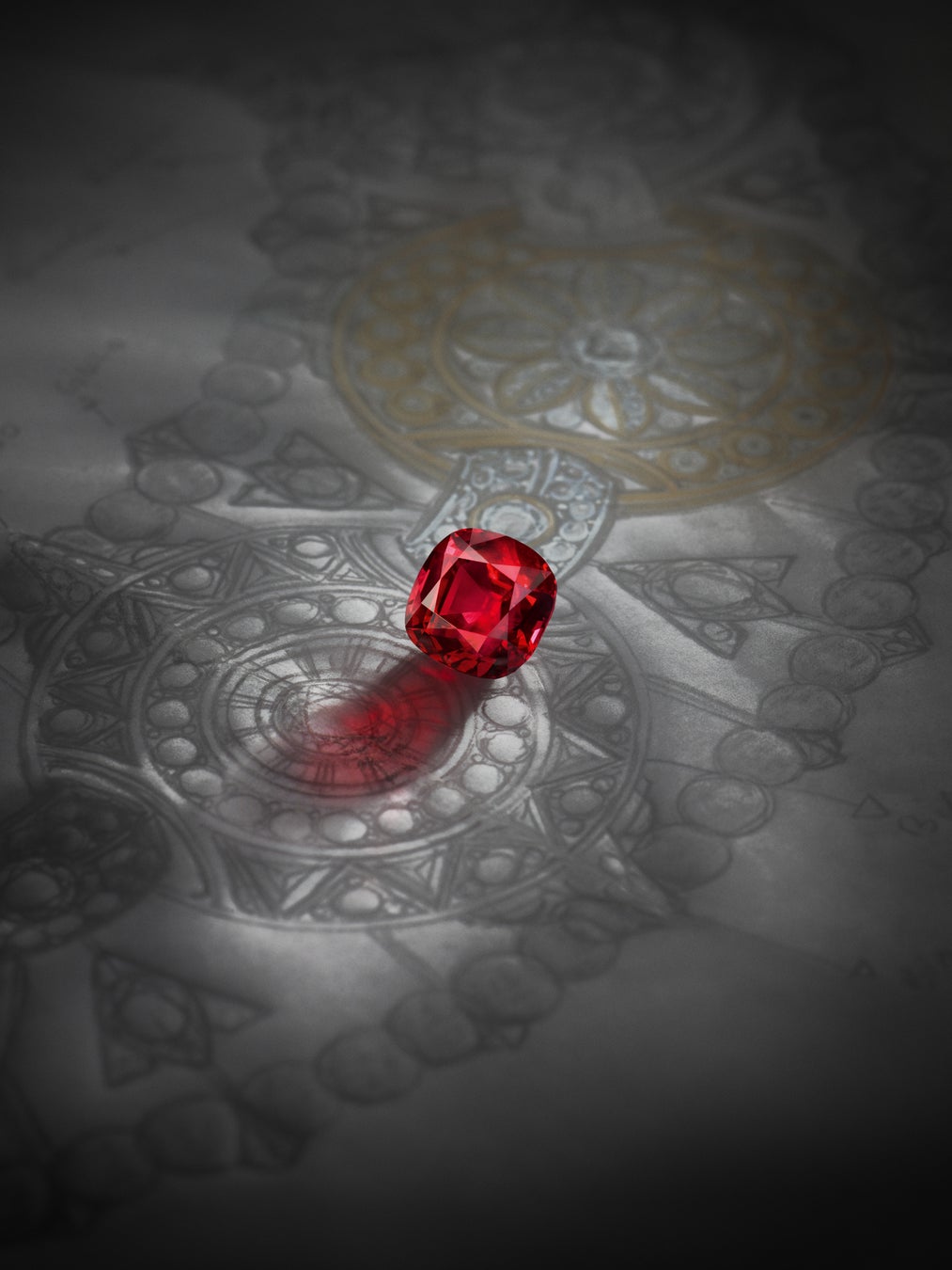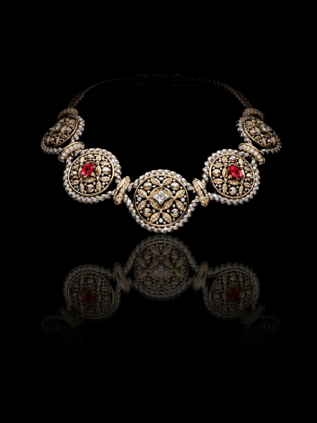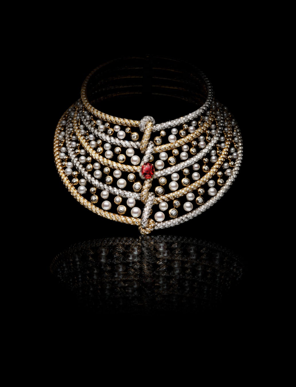 ダイヤモンドのロープとパールで構成された壮観なネックレスは、2,000個以上のパヴェダイヤモンド、100個を超えるクローズドセッティングダイヤモンド、114粒のパールすべてが絡み合いながらロープの列をなし、クリエーションに驚くべき柔軟性と躍動感をもたらしつつ、構造と形状も与えます。第二の肌のようにフィットするこの上なくフェミニンで洗練されたネックレスは、完成までに2,000時間の作業を要しました。この傑作を飾るのは、極上の純度と彩度を誇る鮮やかなピジョンブラッドカラーの6.04カラットのルビー。ブレスレットと2つのリングが、この最終テーマを完成させます。