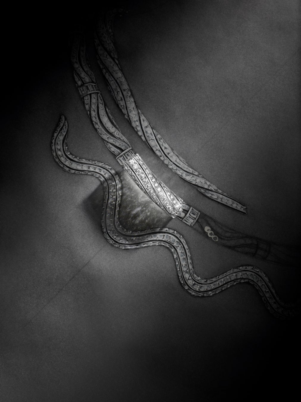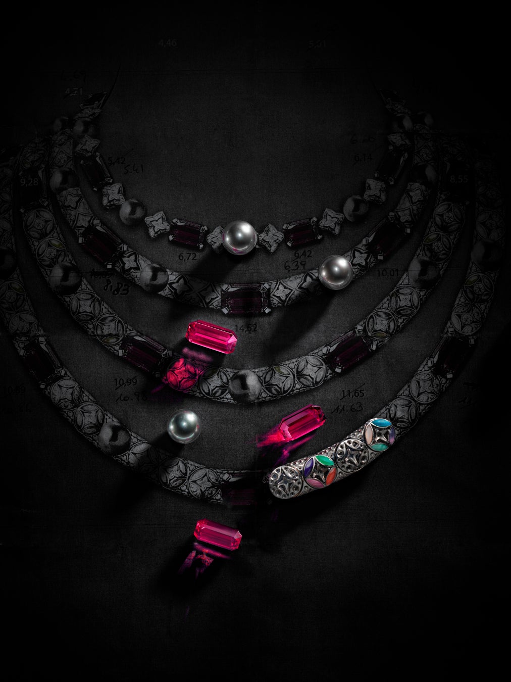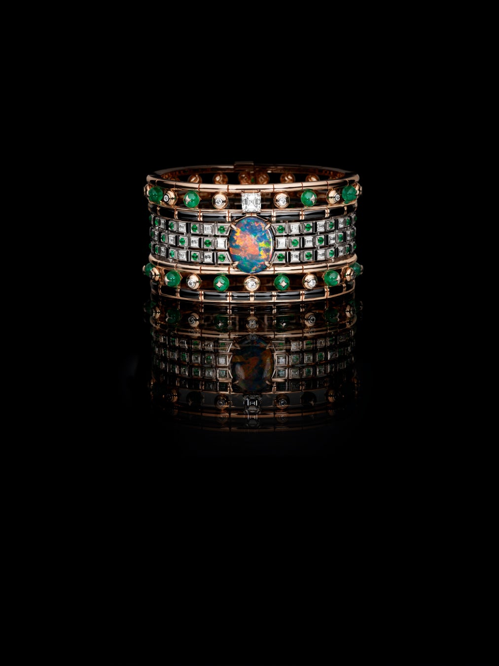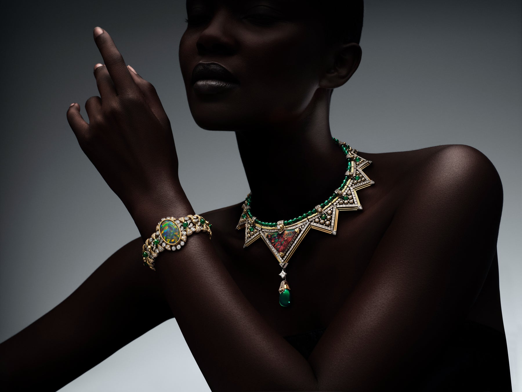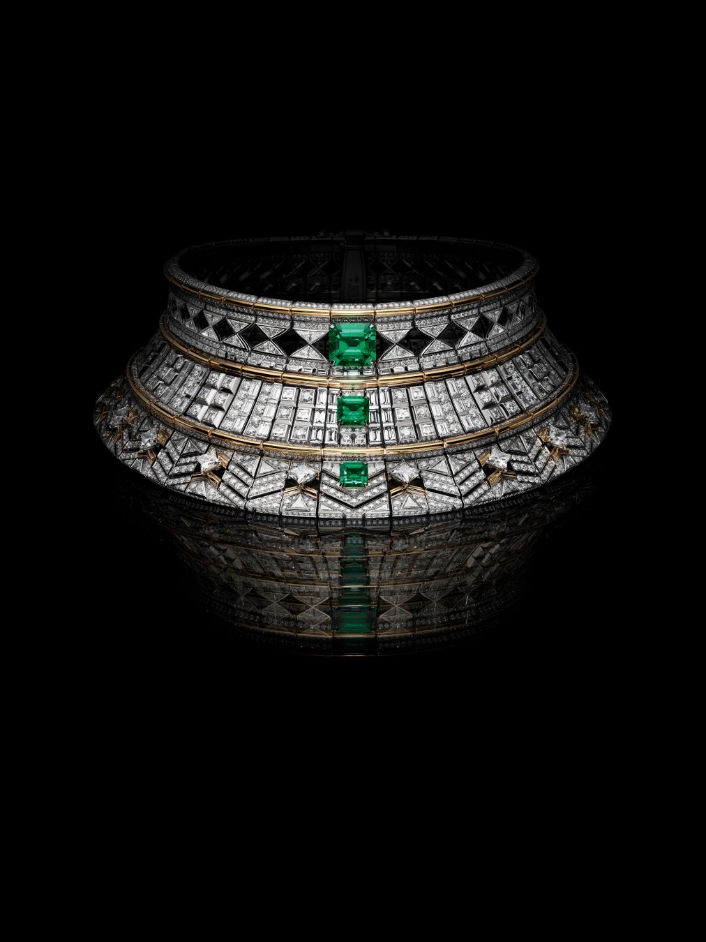 壮大な建築物が石を1つ1つ積み上げて造られていくのと同様に、最高の熟練技もまた、究極の完成を目指して忍耐強く積み重ねられていきます。絶対的な技術に到達し、頂点を極めようとするこの大志を体現するもう1つの作品が、建築的な構造が印象的なハイカラーネックレス。ホワイトゴールドにピンクゴールドをあしらった大胆でモダンなキューバンチェーンをアクセントに、現代性と伝統的なジュエリー製作のサヴォアフェールが巧みに融合した精緻な構造を通して、ダミエ·パターンが再解釈されています。異なるストーンが織りなす、魅惑的なハーモニーの中に浮かび上がるのはダミエ·パターン。交互に配されたダイヤモンドと巧みに織り交ぜられた84石のカボションカットエメラルドや、さらには、156石のカスタムカットのオニキスと共にネックレスのラインを縁取る20石のルビーなど、すべてのエレメントが見事なハーモニーを奏でながらネックレスの構造体を支えています。軽やかさの錯覚を生み出すこのジュエリーは、2,400時間の作業を経て完成。12.85カラットのカボションカットのザンビア産エメラルドと2.59カラットのオーストラリア産ブラックオパールで飾られています。