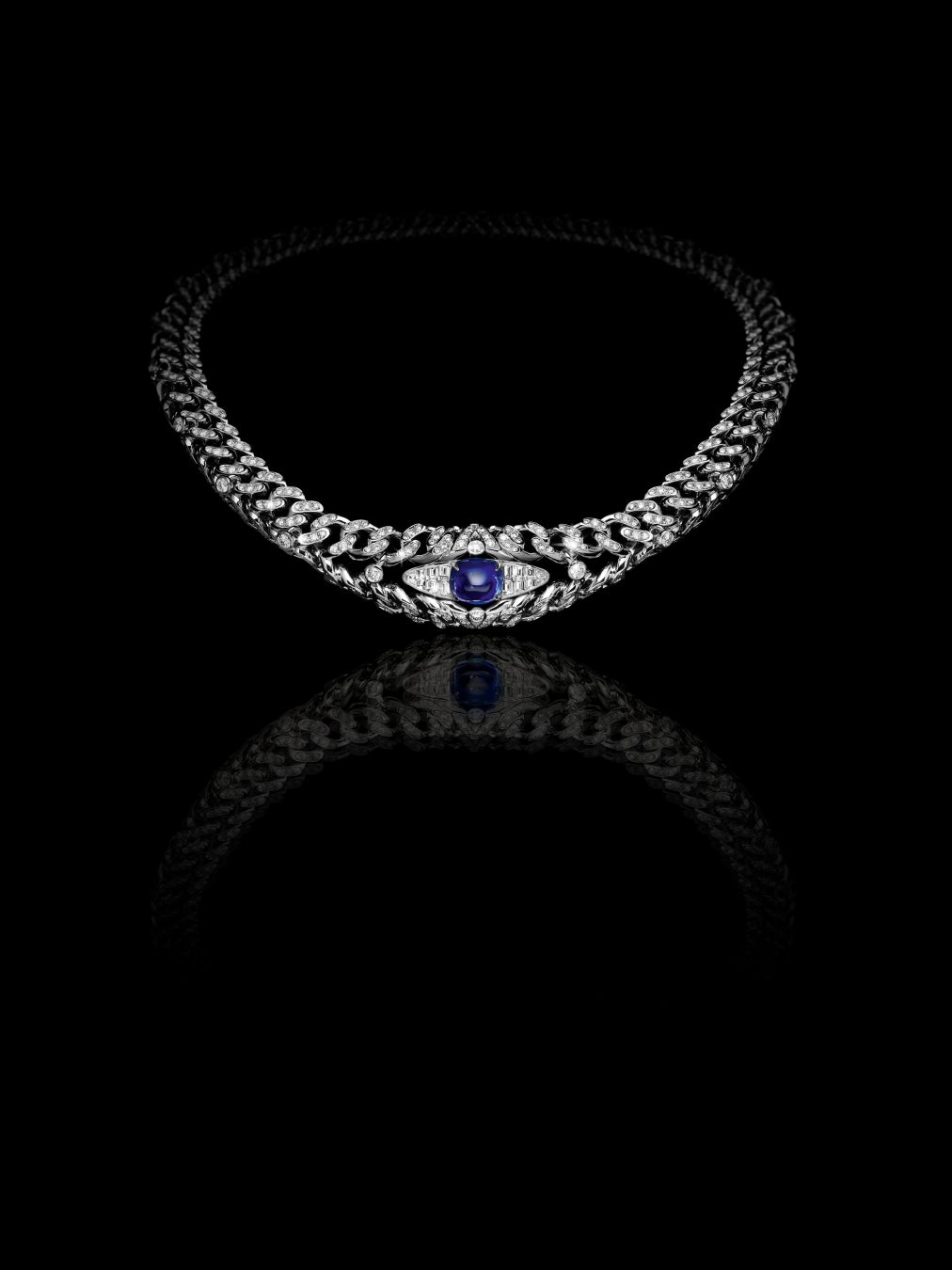 「Keeper」もまた、知恵とノウハウを守るというテーマを継承。盾のモチーフに加え、すべてを見通し、知り、注意深く見守る目のモチーフが登場します。守護者であり、この旅の導き手でもある「Keeper」の主役は、10.12カラットのカボションカットのブルーサファイアを中央に配したネックレス。パヴェチェーンの間に挿入されたブルーサファイアを、ダイヤモンドがセッティングされたトライアングルが取囲む大胆なユニセックスデザインが目を引くクリエーションです。究極のボリューム感と存在感を実現するために何時間もかけて研究を重ねた結果、「V」シェイプ構造を用いて作られたチェーンは、「V」モチーフのアクセントやトランクの釘を想わせるクローズドセッティングのダイヤモンドなど、トランクを彷彿させるモチーフがチェーンをしっかりと固定すると同時に、そのデザインの活力源に。唯一無二の導きの眼という概念を体現するジェンダーレスな「Keeper」には、32.85カラットの神秘的なスリランカ産クリソベリル、3.03カラットの稀少なブラジル産アレキサンドライト、そして大胆なシグネットスタイルのリングにセッティングされた5.02カラットの魅惑的なファンシーダークグレーブルーダイヤモンドなど、類まれで意外性のあるストーンが多く採用されています。