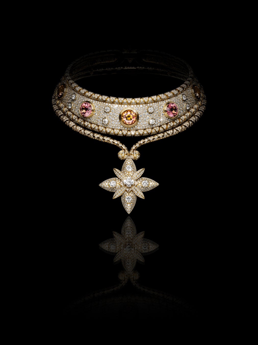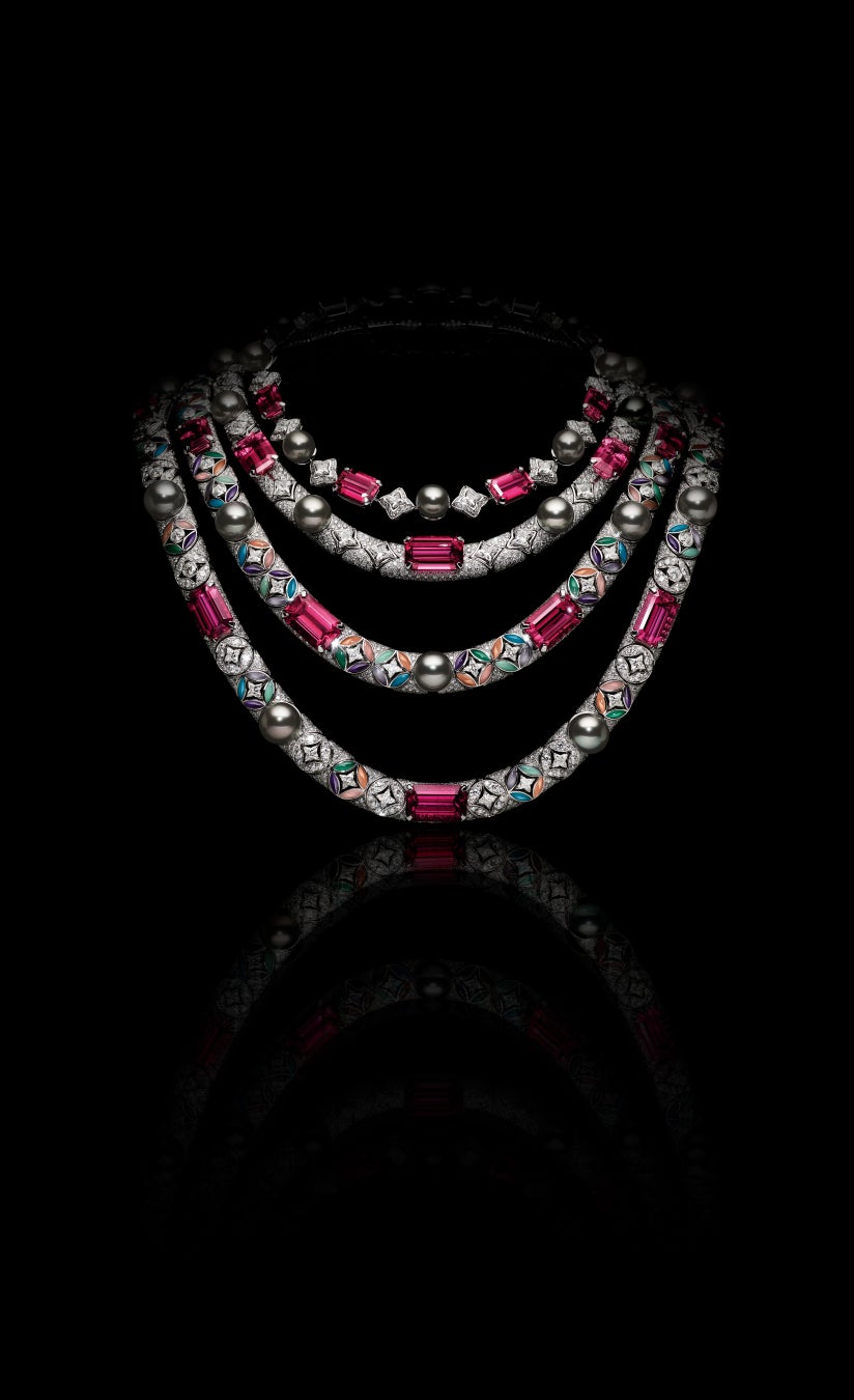 色彩とクリエイティビティから生まれる勢いが、アーティストを、新たな光に満ちたビジョンと悟りの道へと導きます。解き放たれたクリエイティビティは、輝きの源、鮮やかな光輪、そしてその旅路を導く力強く変幻自在なオーラとなります。クリエーションを通して進化し続ける「Aura」もまた、メゾンが導きの星として毎年再考し、再定義しているシグネチャーのモノグラム·フラワーを取入れたデザインを展開。「Virtuosity」コレクションによる再解釈は、合計48.06カラットのブラッシュトーントルマリンが美しくセッティングされた現代的でこの上なくフェミニンな若々しいデザインで表現されています。3種類のスタイリングを楽しむことができる変形可能なネックレスには、イエローゴールドとホワイトゴールドのベースに、ピンク、ピンキッシュオレンジ、オレンジピンクのトルマリンをセッティング。天空に輝く星のようなモノグラム·フラワーのペンダントが揺れ、その頂点には同色の2.31カラットのLV モノグラムフラワーカットダイヤモンドがきらめきを添えます。