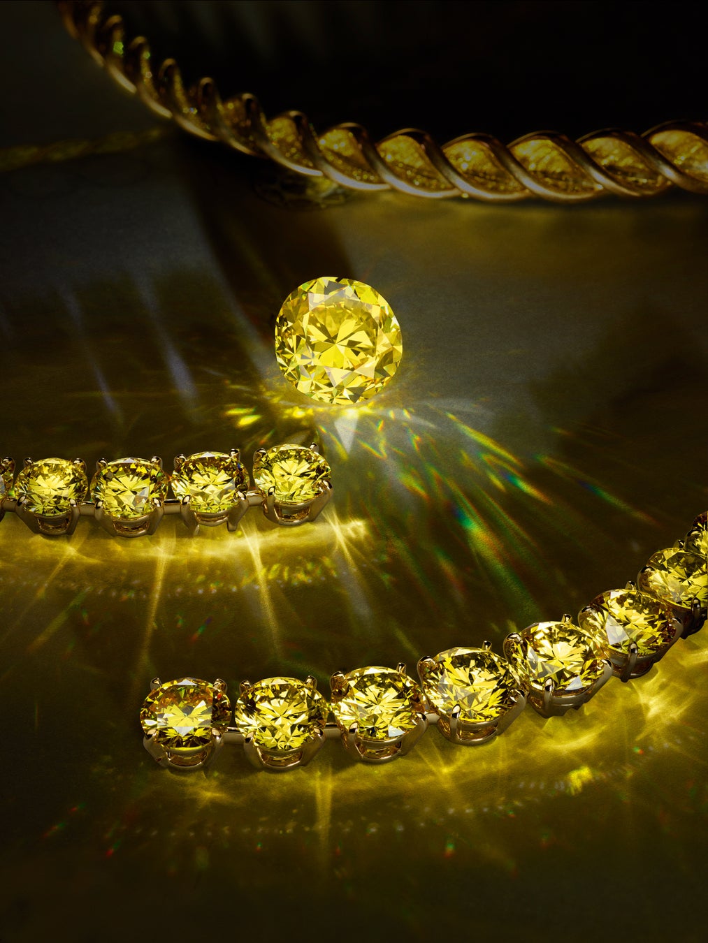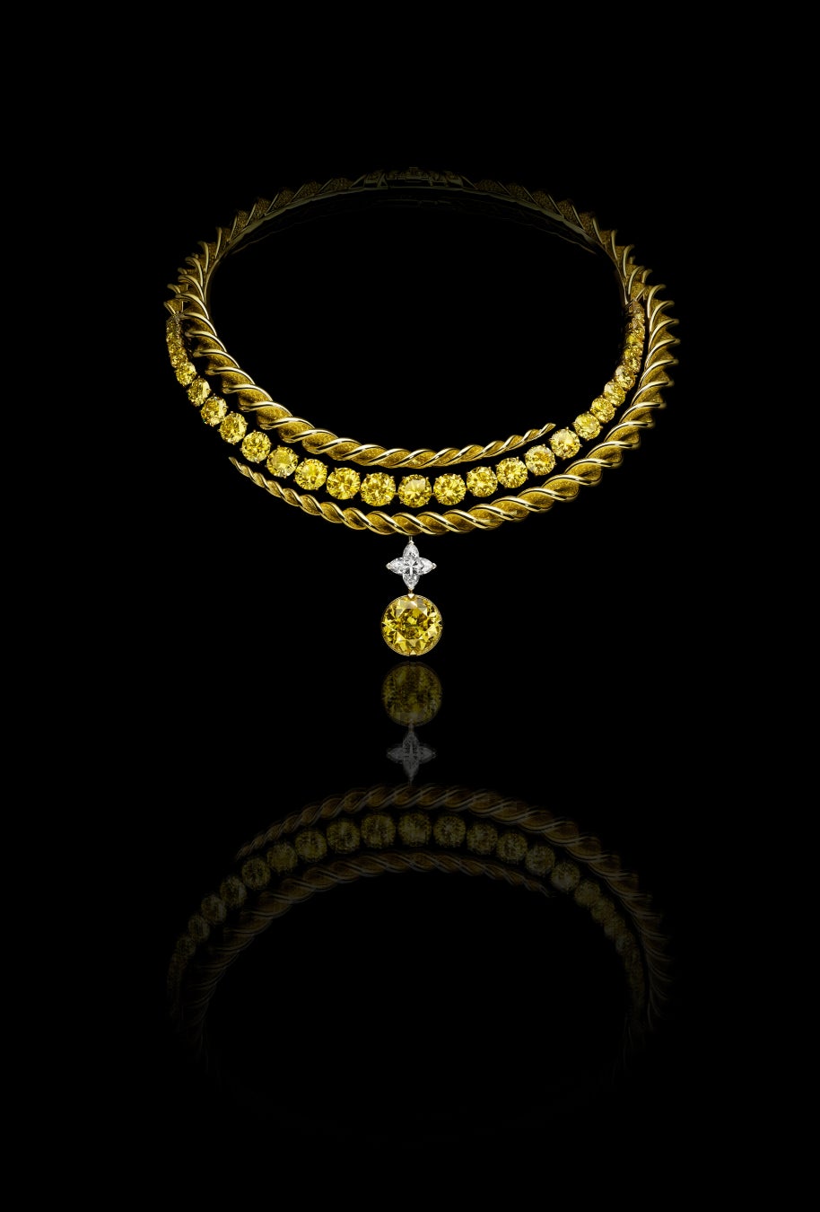 「The World of Creativity」、そして「Virtuosity」コレクションは、ピュアなクリエイティビティが自由に溢れ出る中で、その華麗なる頂点に達します。あらゆるコードから解放されたアーティストは、ミニマリズムと純粋さを駆使し、その並外れた才能を大胆に発揮。その象徴となるのが、無限の螺旋を描きながら輝きを放つイエローダイヤモンドを主役とするクリエーションです。太陽のような色合いをイメージしたイエローゴールドとダイヤモンドで構成されたジュエリーは、7年の歳月をかけて調達された合計46.13カラット、27石のラウンドカットイエローダイヤモンドが唯一無二の輝きを放つストーンの集合体。稀少なグリーン、パープル、ピンクのきらめきをアクセントとして、色合いと視覚的調和を最大限に引き出すように熟考された、圧巻の配置とセッティングです。14カラットの見事なシングルラウンドイエローダイヤモンドと3.88カラットのLV モノグラムスターカットダイヤモンドが優雅に揺れ動き、創造的自由を放つデザインは、独創性溢れるコレクションを代表する逸品。