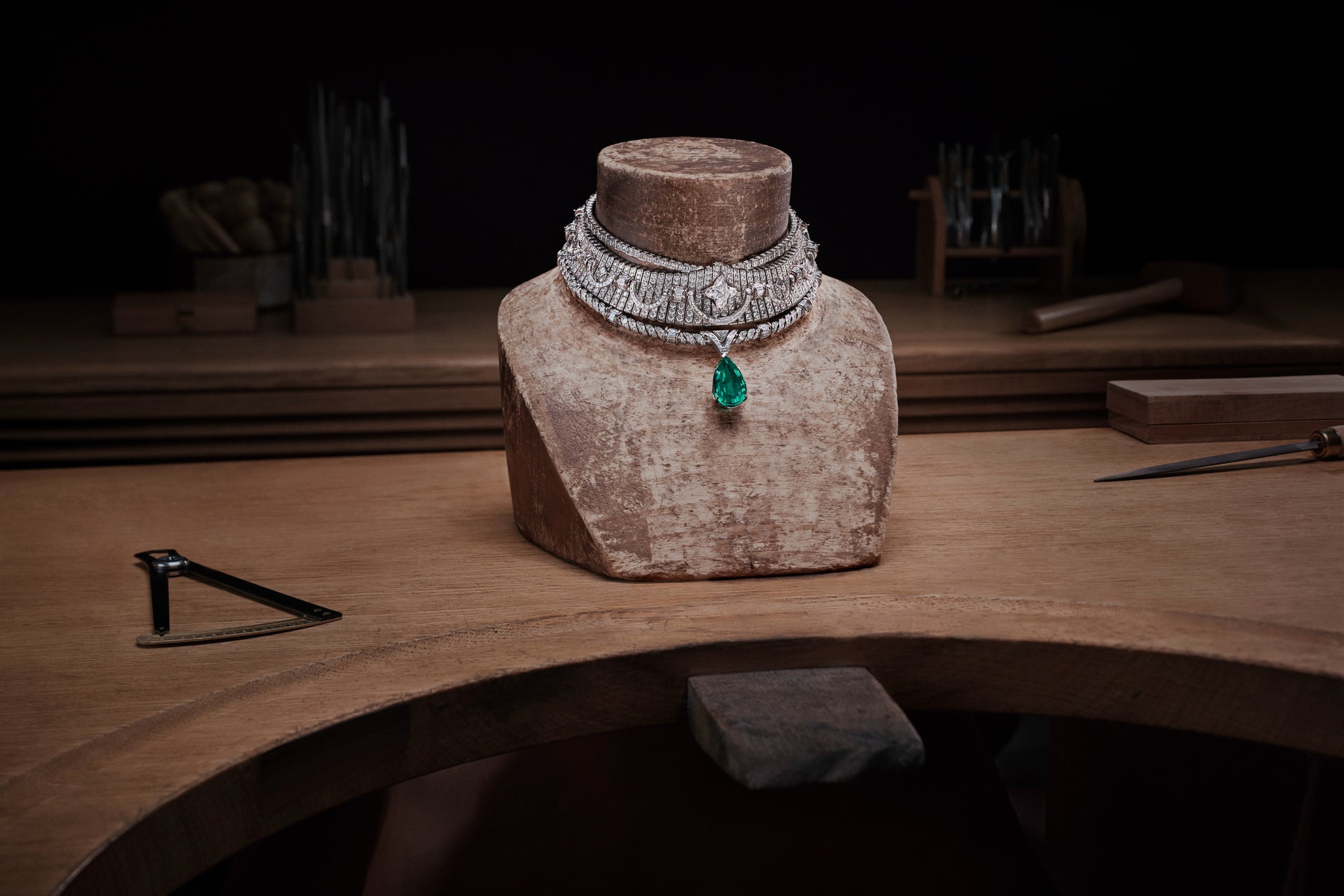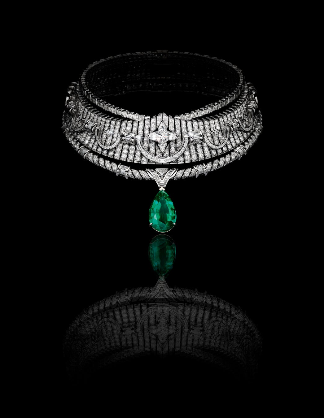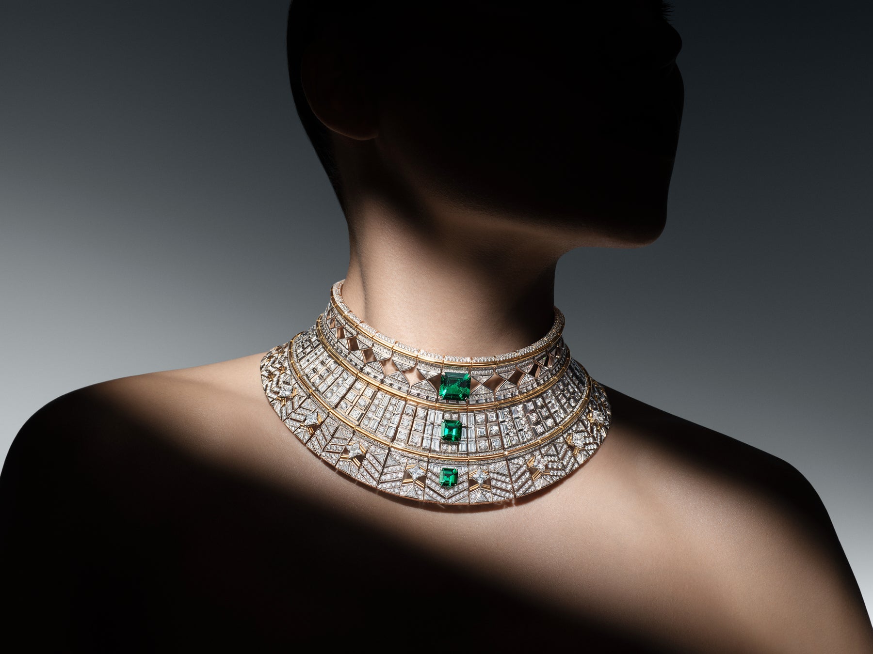 ノウハウが保護され安全であれば、知識は自然とその門戸を開け、秘密が明かされていくでしょう。「Maestria」は、アーティストが絶対的な技術の習得へと一歩ずつ近づきながら、器用さと厳格さ、正確さと卓越性を身に付けていく修業の過程と大志を表現しています。この努力とディテールへのこだわりを体現しているのが、ルイ·ヴィトンのハイジュエリーを象徴する2つの素材、ホワイトゴールドとイエローゴールドをミックスした大胆なハイカラーネックレス。建築学と幾何学の卓越した技能と知識が融合した傑作です。8.88カラットのストーンを筆頭に、調和の取れた色彩を放つ稀少で見事なコロンビア産エメラルド3石がクリエーションを飾ります。カスタムカット276個を含むダイヤモンド3,593個がセッティングされたネックレスは、メゾンならではのシグネチャーである「V」モチーフ、シェブロンパターン、アイコニックなダミエ·パターンが輝き、さらにオープンワークデザインで囲まれたカイト·モチーフが存在感を放ちます。