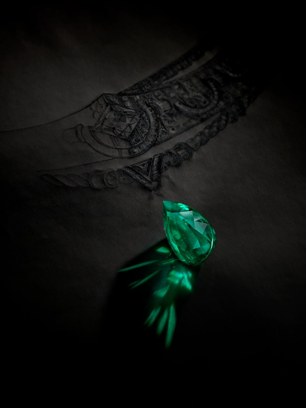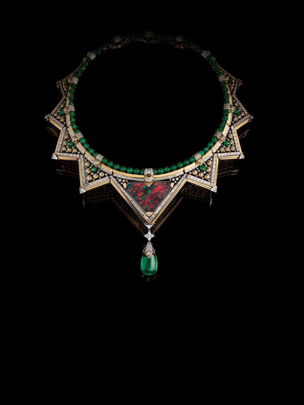 聖なる知識の秘密が閉じ込められているかのような、見る者を恍惚とさせる魅惑的なネックレスには、30.56カラットのトライアングルカットのオーストラリア産ブラックオパールをセッティング。レッドと鮮やかなグリーンが対話するユニークな色合いを有するオパールは、その魅惑的な力で、もう1つのストーン、28.01カラットの見事なドロップシェイプのエメラルドへと視線を引き寄せます。大胆な幾何学模様とグラフィックなデザインが特徴のこのクリエーションは、完成までに1,500時間の作業を要しました。トライアングル·モチーフは、トランクの角ばったコーナーや、釘を模したクローズドセッティングのダイヤモンドなど、ルイ·ヴィトンのトランク製造業者としてのサヴォアフェールを彷彿させる他のデザイン要素にも反映されています。