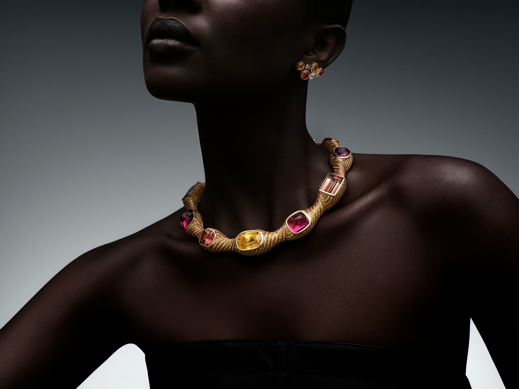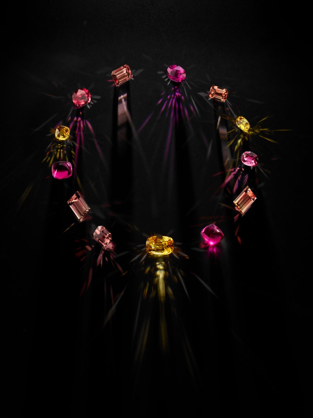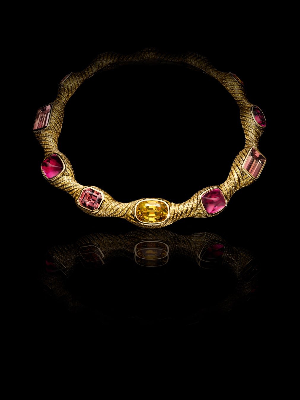 鮮烈な色彩が満ち溢れ、より明るく、より鮮やかに輝き続けます。クリエイティビティは力強い色彩の波へと変貌し、そこから放たれる豊かな輝きが瑞々しいクリエーションへと取込まれ、コードから解放される喜びによってさらに活気を帯びます。この華やかさと寛大さの頂点を象徴するのが、イエローゴールドのネックレス。総重量204.63カラットのストーンは、多様なカット、カラー、シェイプが調和した豊かなコンビネーションで構成。イエローサファイア3石を軸に、10石のトルマリンが繊細なパウダーピンクのトーンで輝きを添えます。サイズは、10.07カラットから41.62カラットまでとボリュームたっぷり。カラーは、グリーンからピンクに変化するバイカラートルマリンのように、1つのストーンの中でも変化します。