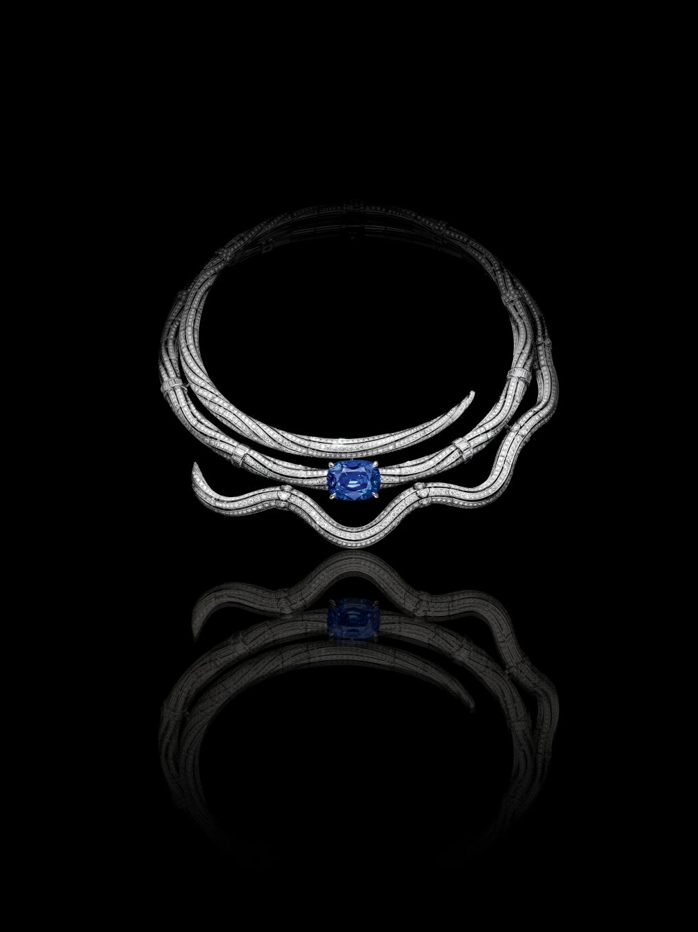 アーティストは、躍動感溢れる動きに押し流され、その流れと解放感に刺激された想像力を駆使して境界を打ち破り、新たな可能性を切り拓いていきます。「Motion」は、行く手にあるものすべてを巻き込みながら、この解き放たれたクリエイティビティを前進させます。新たなエネルギーが振動し、広がり、際限なく花開く創意工夫。この魅惑的なエネルギーと抑えきれない躍動感は、ダイヤモンドとサファイアを主役とするピュアなテーマで描かれた「Motion」のうねるような波動で表現されています。透き通ったブルーの色合いが美しい35.69カラットのスリランカ産サファイアをセッティングした極めて優美なネックレスは、5ヶ月間にわたる研究を通して熟考された、丸みを帯びたボリュームと配置の流麗な波のようなフォルムが特徴。