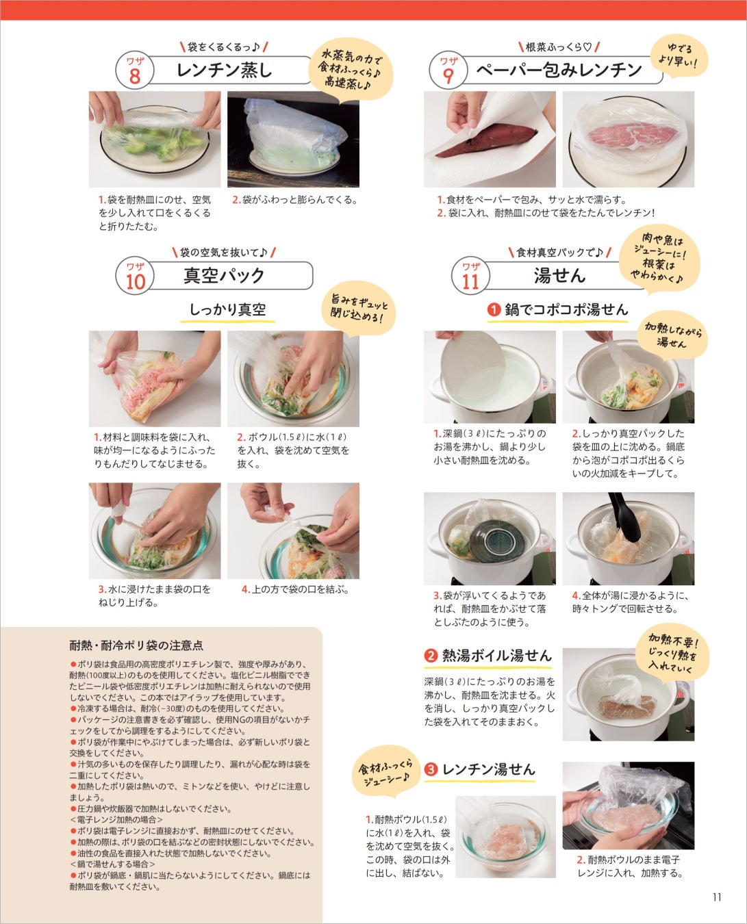 粉ものを混ぜる、食材を調味液に漬け込むだけと思っていませんか? 耐熱・耐冷ポリ袋は、電子レンジにそのまま入れての加熱が可能。ごはんを炊く、野菜を蒸す、真空状態にしてボイルするなど、袋1つで幅広い調理ができます。