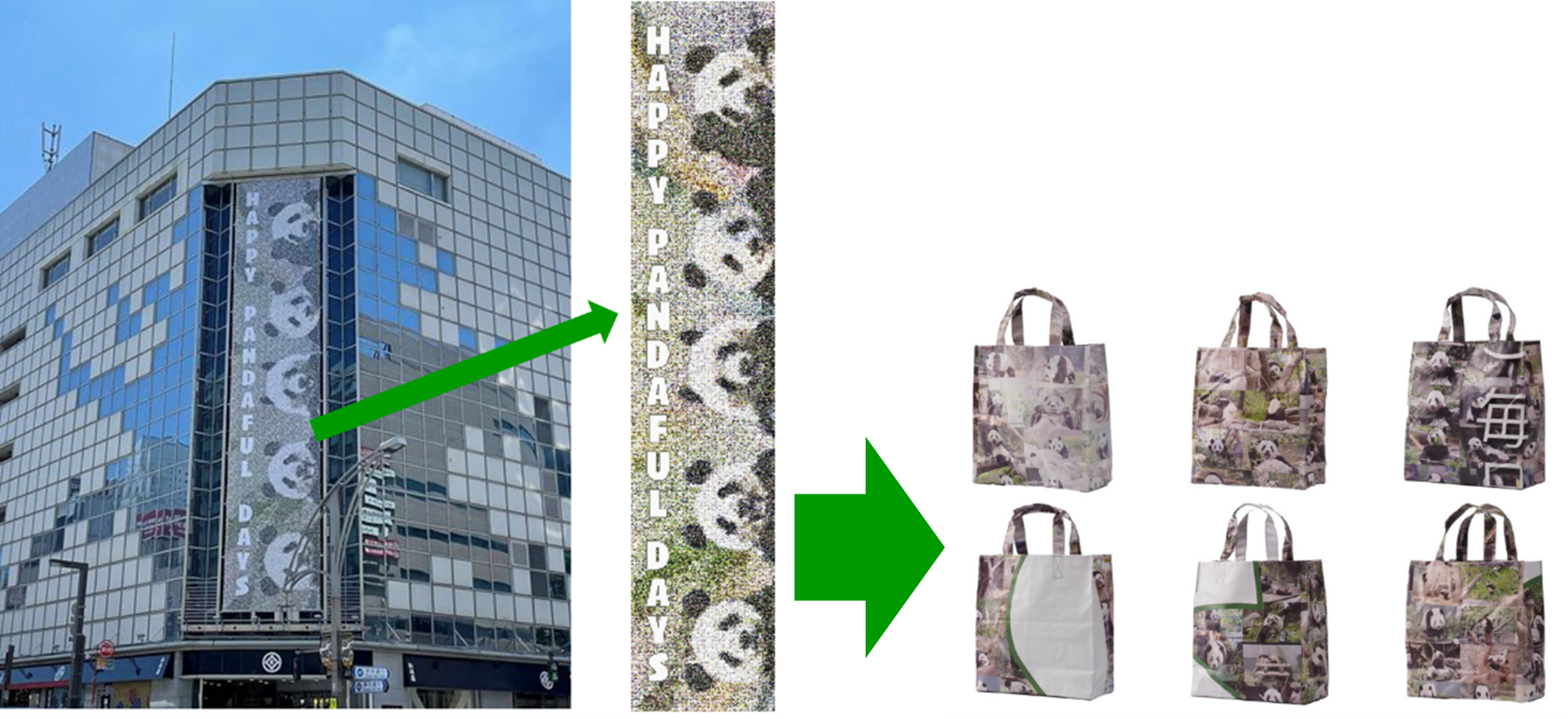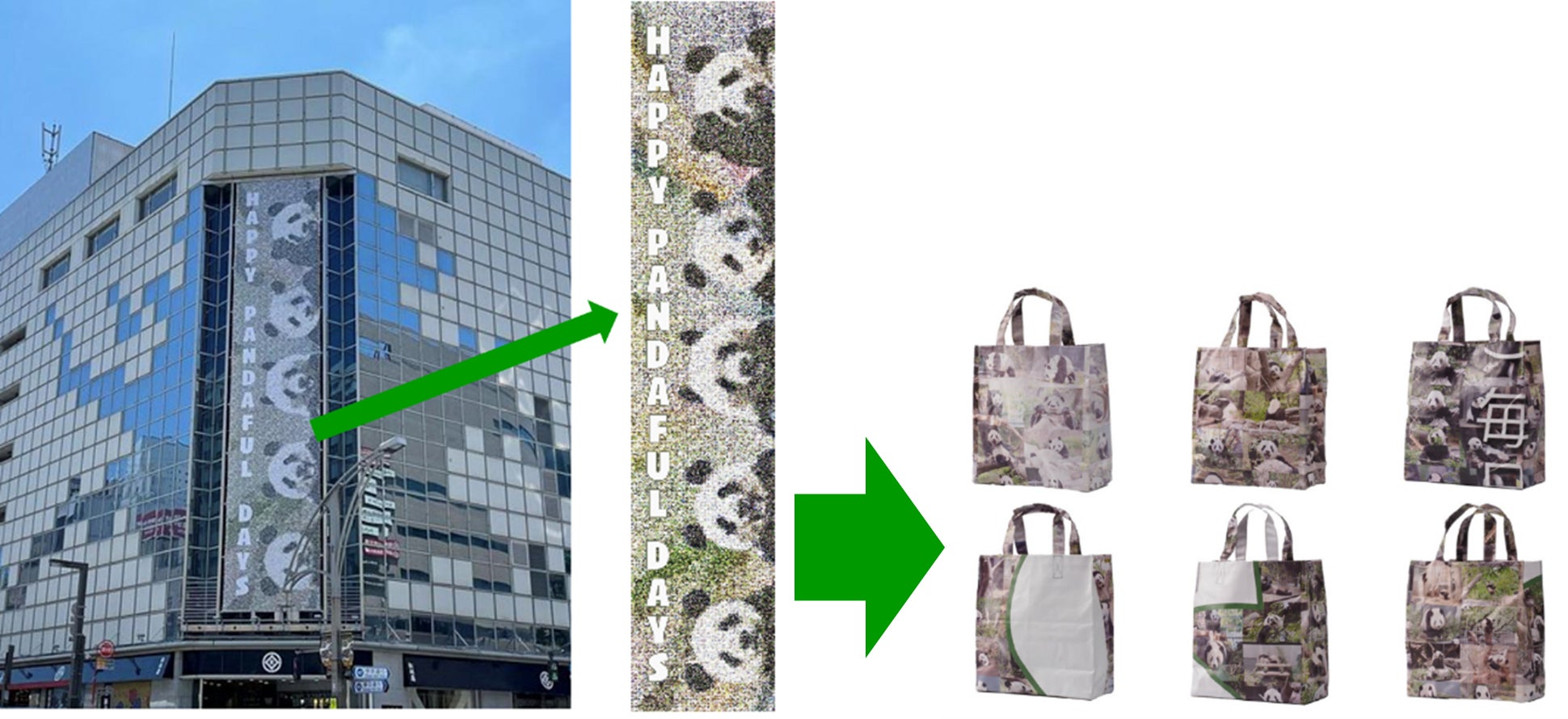第4弾となる今回は、今年6月、上野のジャイアントパンダのお誕生日を記念し開催された全館企画「HAPPY PANDAFUL DAYS」で使用したモザイクアート広告幕を、ミニサイズのエコバッグに作り変えてオンラインにて抽選販売いたします。この取り組みを通して、レジ袋(プラ)の削減と広告幕焼却処分時のCO2削減につなげることを狙いとしています。