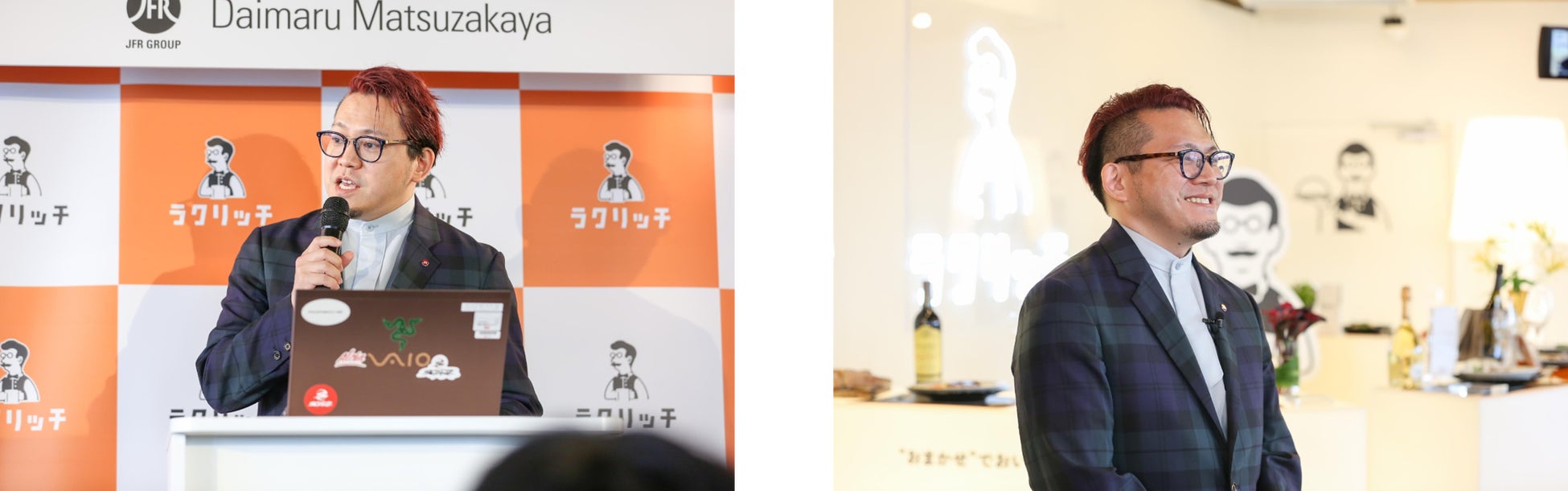 大丸松坂屋百貨店 DX推進部 専任部長 ラクリッチ事業責任者 岡崎 路易より、ブランドのサービス概要や事業戦略についてプレゼンテーションいたしました。事業の背景については、「中期経営計画のDX推進を一言で表すならば “時間と場所の制約の克服” です。営業時間という時間の制約と店舗という場所の制約を克服しなければ、私たち百貨店の未来はないと感じました。タッチポイントのオンライン化と我々流のオンラインビジネスに取り組む必要があります。」とコメント。