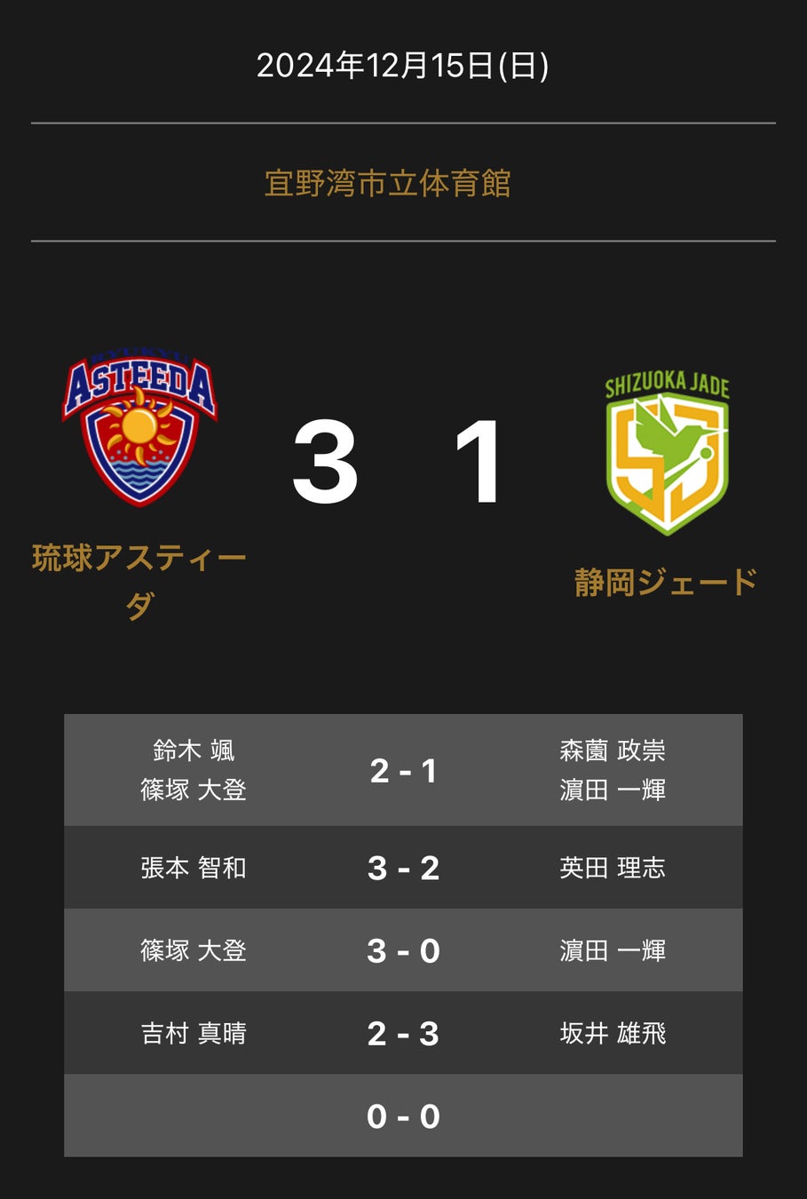 ノジマTリーグ 2024-2025シーズン 公式戦 12月15日開催 琉球アスティーダ vs 静岡ジェードの試合は3-1で琉球アスティーダが勝利しました。