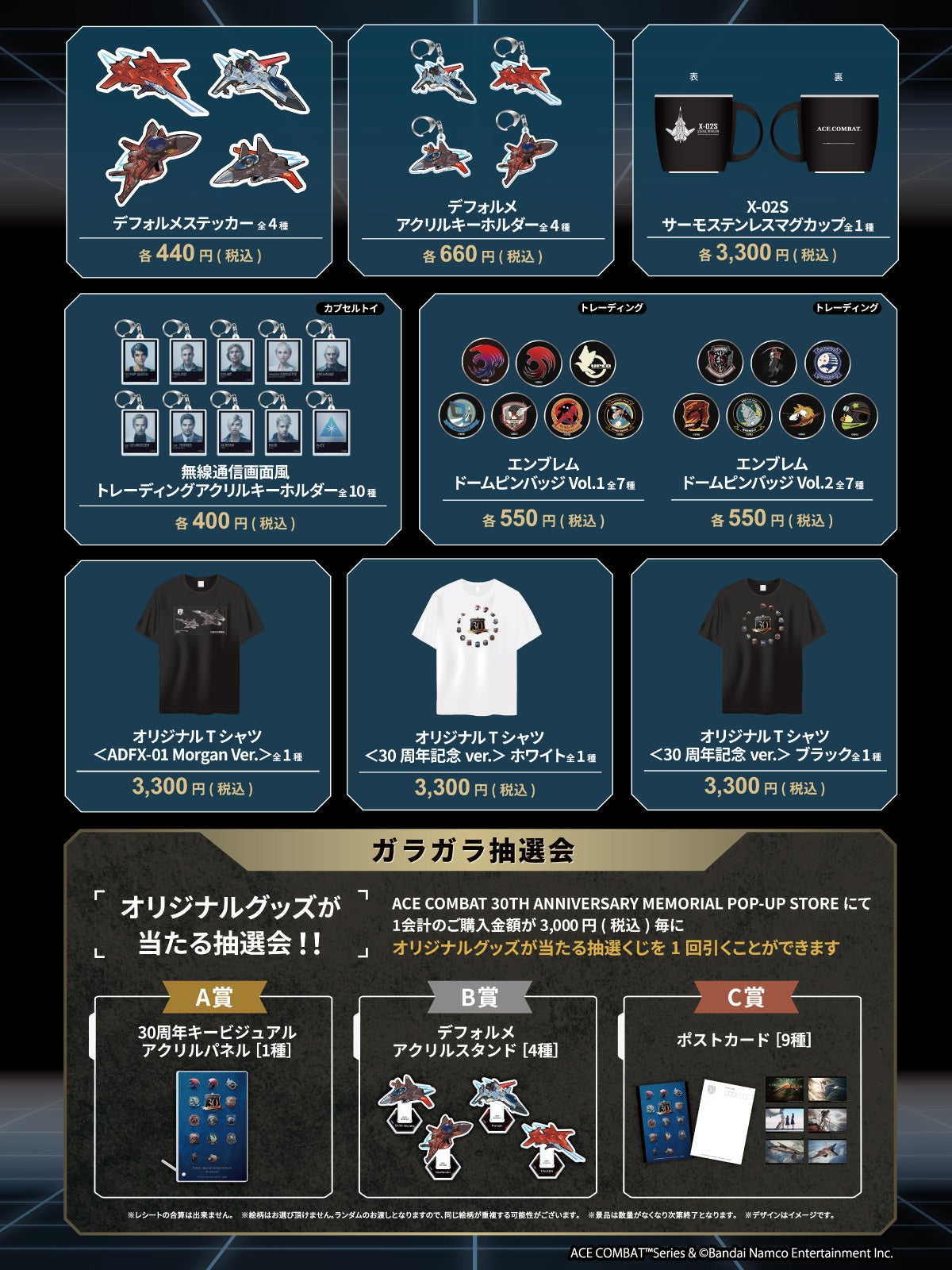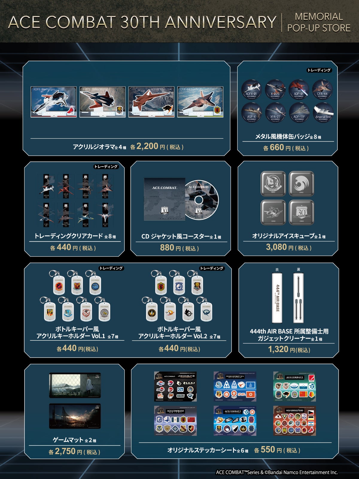 株式会社バンダイナムコエンターテインメントから発売された人気フライトシューティングゲーム「ACE COMBAT」30周年を記念し、キャラクターグッズの商品企画・製作・販売を行なっている株式会社BeBlockがACE COMBAT 30TH ANNIVERSARY MEMORIAL POP-UP STOREを全国3会場で開催します。
