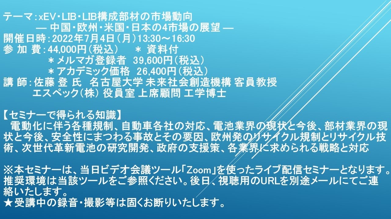 先端技術情報や市場情報を提供している(株)シーエムシー・リサーチ(千代田区神田錦町: https://cmcre.com/ )では、 各種材料・化学品などの市場動向・技術動向のセミナーや書籍発行を行っておりますが、 このたび「xEV・LIB・LIB構成部材の市場動向 ― 中国・欧州・米国・日本の4市場の展望 ―」と題するセミナーを、 講師に佐藤 登 氏 名古屋大学 未来社会創造機構 客員教授 エスペック(株) 役員室 上席顧問 工学博士)をお迎えし、2022年7月4日(月)13:30より、 ZOOMを利用したライブ配信で開催いたします。 受講料は、 一般:44,000円(税込)、 弊社メルマガ会員:39,600円(税込)、 アカデミック価格は26,400円(税込)となっております(資料付)。