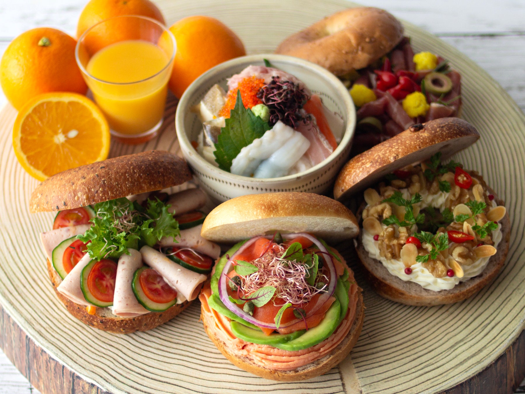 当ホテルが自信をもっておすすめするのは、香ばしいベーグルにハム、サーモン、新鮮な野菜をたっぷりと挟んだ特製ベーグルサンドです。そして、贅沢な具材を自由に乗せていただく海鮮丼もご注目ください。サーモン、国産生海老、赤魚の昆布〆、マグロのネギトロ、烏賊ソーメン、生タコといった海の幸が、それぞれの持ち味を活かし、奥深い旨味の広がりを演出します。これらのこだわりの逸品を、すべてお好きなだけご堪能いただけます。