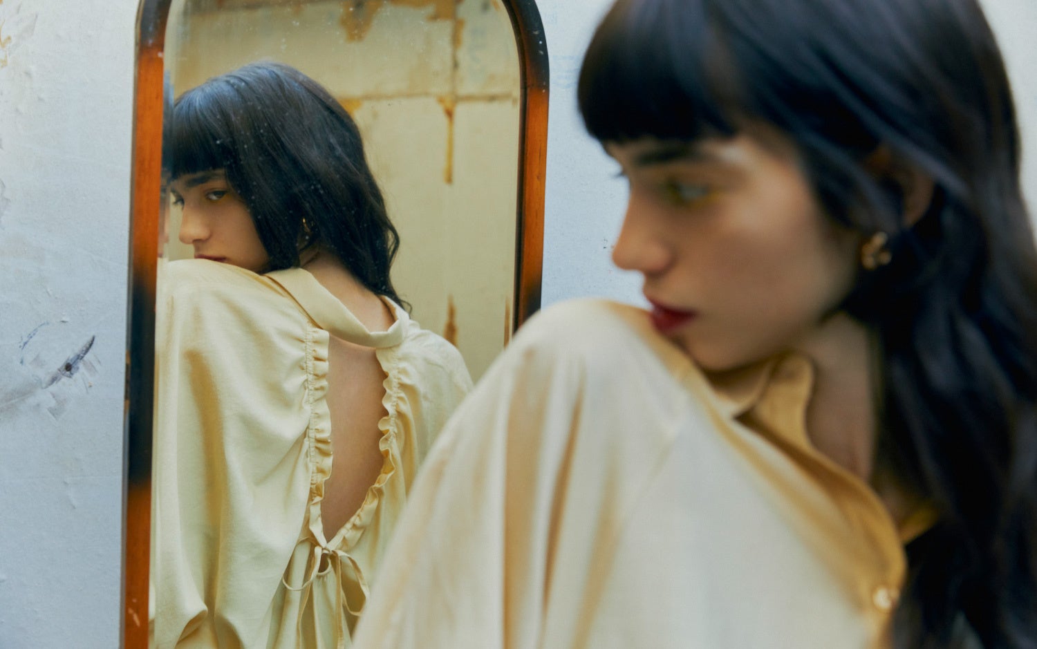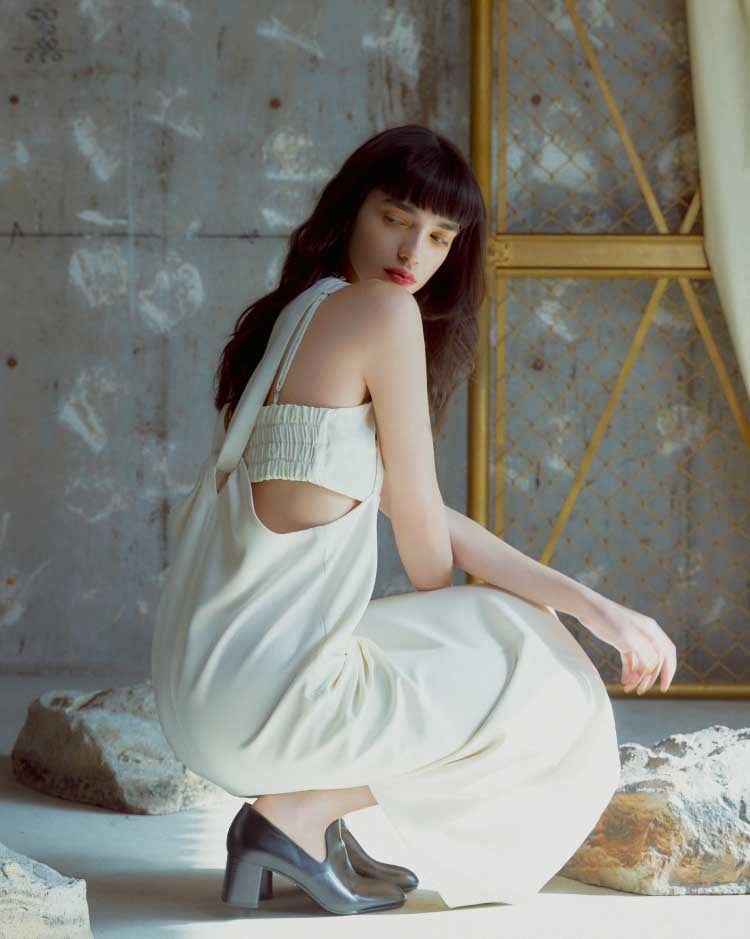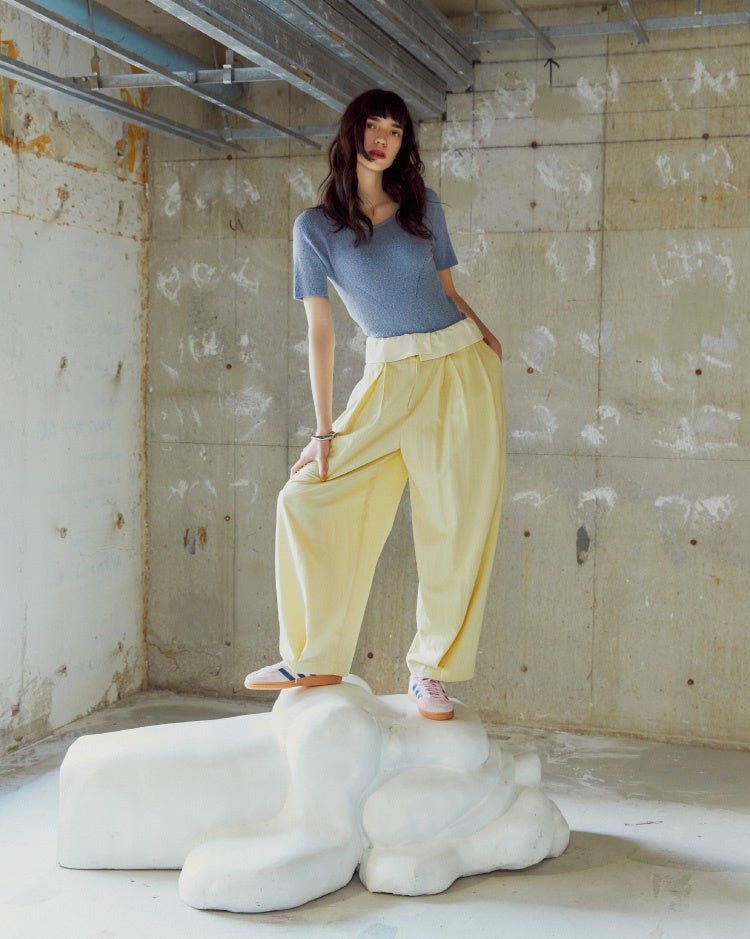 今シーズンは、肌見せがポイントのビスチェ付きワンピースによるヘルシーな着こなしや、背中のカットアウトが印象的なブラウスが登場。また、ブルーのニットにイエローのイージーパンツ、足元にはピンクのスニーカーを合わせ、春の色彩をふんだんに重ねた遊び心あるカラーコーディネートにもご注目ください。