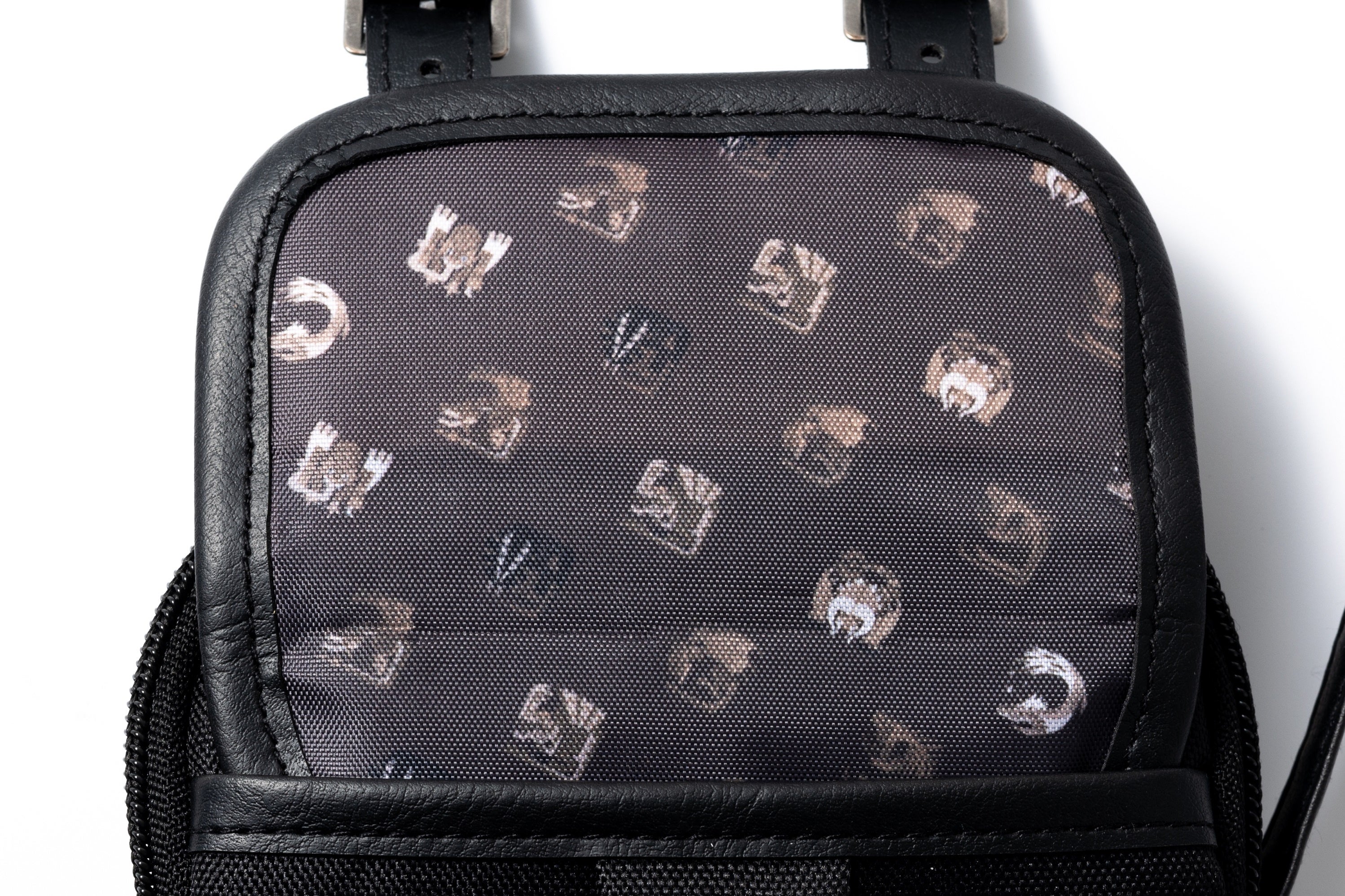シンプルなブラックショルダーの正面にはさりげなくロゴがデザインされ、裏地はトビカガチやリオレウスやなど人気モンスターアイコンをプリント。モンハンファンにはたまらないデザインです。
