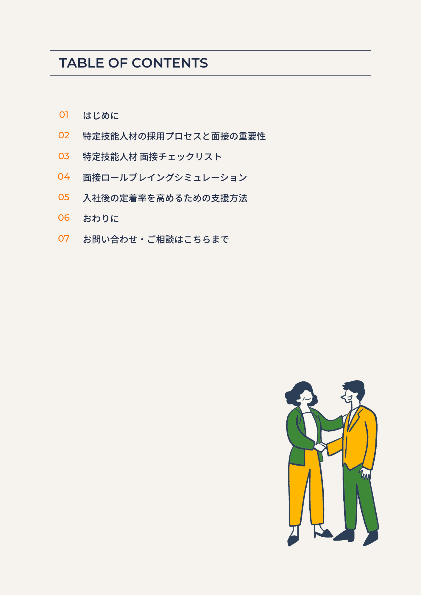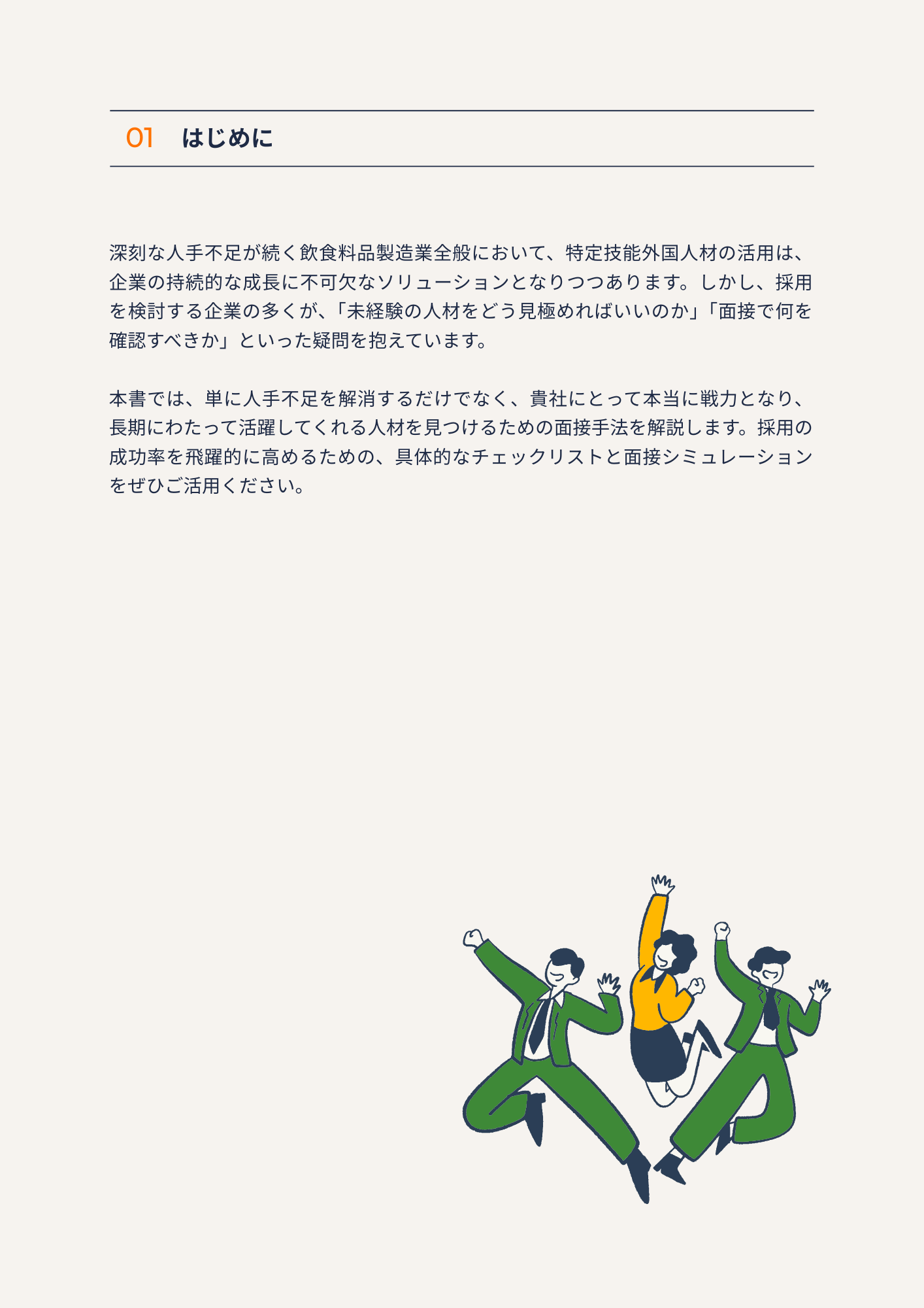本ガイドは、この「コミュニケーションの壁」と「入社後の定着」という企業の最も切実な課題を解決するために作成しました。面接で「即戦力」となる人材を見極めるための独自のチェックリストを提供しており、特に、飲食料品製造業界の未経験者でも本質的な能力を把握できるよう、コミュニケーション能力や問題解決能力に焦点を当てた質問例を多数掲載しています。さらに、面接のロールプレイングシミュレーションを通じて、実践的なノウハウを学ぶことができます。また、入社後の生活サポートやキャリアパスの提示方法など、人材の定着率を高めるための具体的な支援策も解説しています。