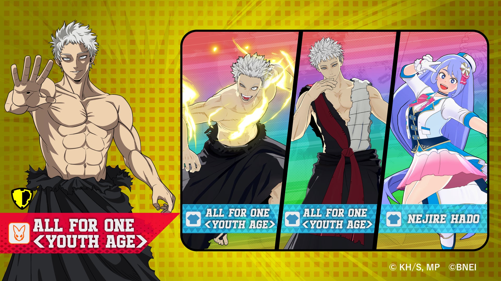 「オール・フォー・ワン<青年期>」が参戦!様々な”個性”を組み合わせ、攻撃範囲が変化する”個性”技に加え、相手の特殊アクションを封じることも可能だ!状況に応じて使い分け、戦場を制圧せよ!