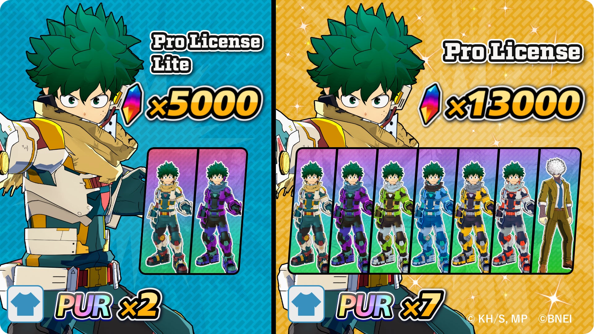 シーズン13ライセンスが登場中!「緑谷出久 OFA(“個性”アシストギア OFAver.)」の衣装や様々なアイテムが入手できる!さらに今シーズンも、プロライセンスの報酬のうち1~25までが手に入る「プロライセンス・ライト」が利用可能!