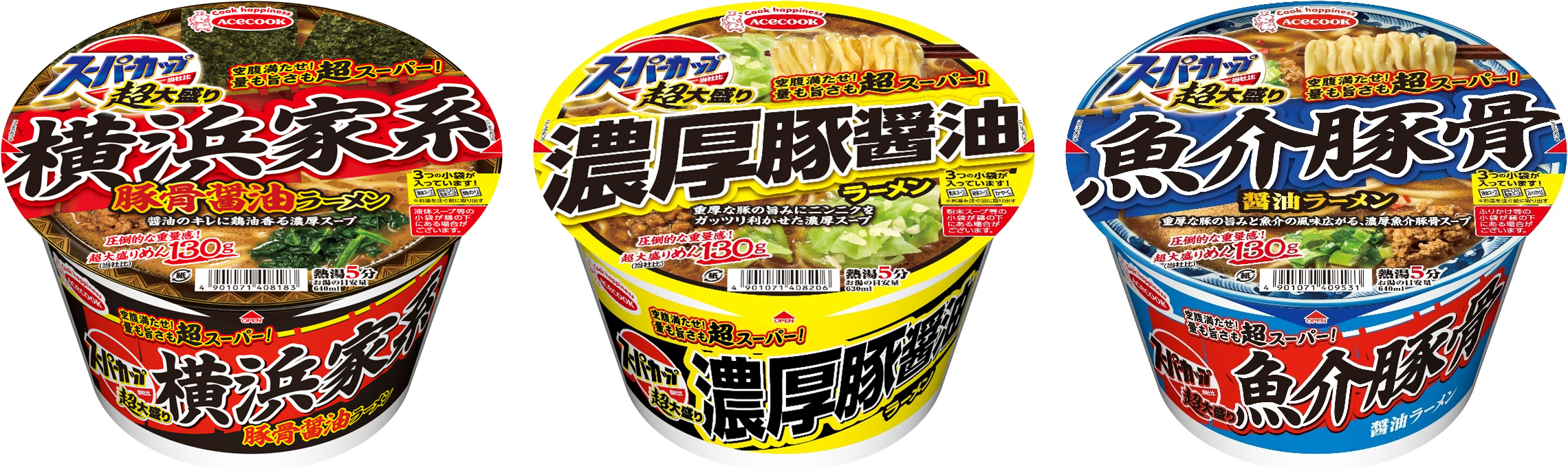 エースコック株式会社(本社:大阪府吹田市 代表取締役社長:村岡寛人)は、2026年3月23日より、「超大盛りスーパーカップ 横浜家系豚骨醤油ラーメン/濃厚豚醤油ラーメン」をリニューアル、「スーパーカップ超大盛り 魚介豚骨醤油ラーメン」を新発売します。
