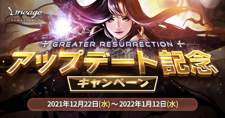 PC向けオンラインゲーム『リネージュ』をサービス、運営しているエヌ・シー・ジャパン株式会社(東京都港区、代表取締役:金 澤憲(キム テクホン))は、2021年12月22日(水)に、最新アップデート「Greater Resurrection」を実施したことをお知らせします。あわせて、アップデートを記念したキャンペーンやキャラクター成長支援イベント「成長のコイン」の開催をお知らせします。