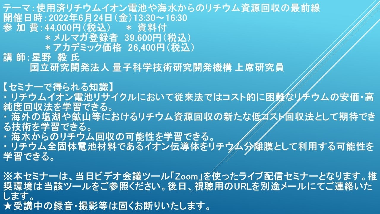 先端技術情報や市場情報を提供している(株)シーエムシー・リサーチ(千代田区神田錦町: https://cmcre.com/ )では、 各種材料・化学品などの市場動向・技術動向のセミナーや書籍発行を行っておりますが、 このたび「使用済リチウムイオン電池や海水からのリチウム資源回収の最前線」と題するセミナーを、 講師に星野 毅 氏 国立研究開発法人 量子科学技術研究開発機構 上席研究員)をお迎えし、2022年6月24日(金)13:30より、 ZOOMを利用したライブ配信で開催いたします。 受講料は、 一般:44,000円(税込)、 弊社メルマガ会員:39,600円(税込)、 アカデミック価格は26,400円(税込)となっております(資料付)。