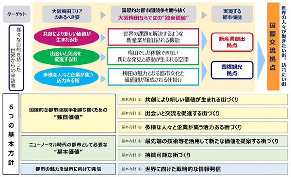 「梅田ビジョン」は、大阪梅田が「国際交流拠点」となることを目指すものであり、そのためには、大阪梅田ならではの「独自価値」によって「新産業創出拠点」「国際観光拠点」としての機能を創出すること、さらには、ニューノーマル時代の都市として必要な「基本価値」を強化することと、都市の魅力を世界に向けて発信することが必要であると考えられることから、以下のとおり6つの基本方針を設定しています。