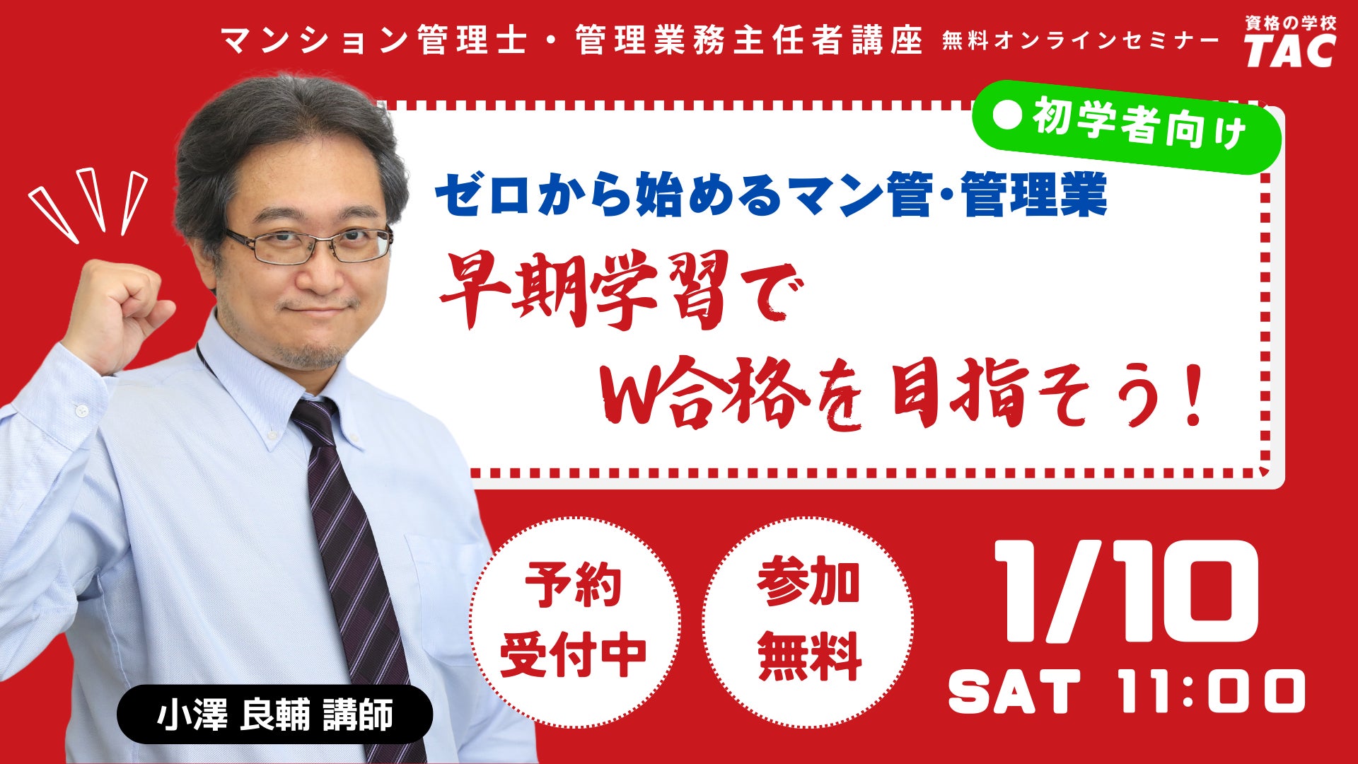 TAC株式会社(東京都千代田区、代表取締役社長:多田 敏男)は、マンション管理士・管理業務主任者試験合格を目指す方を対象とした無料オンラインセミナーを2本、2026年1月10日(土)に開催いたします。
