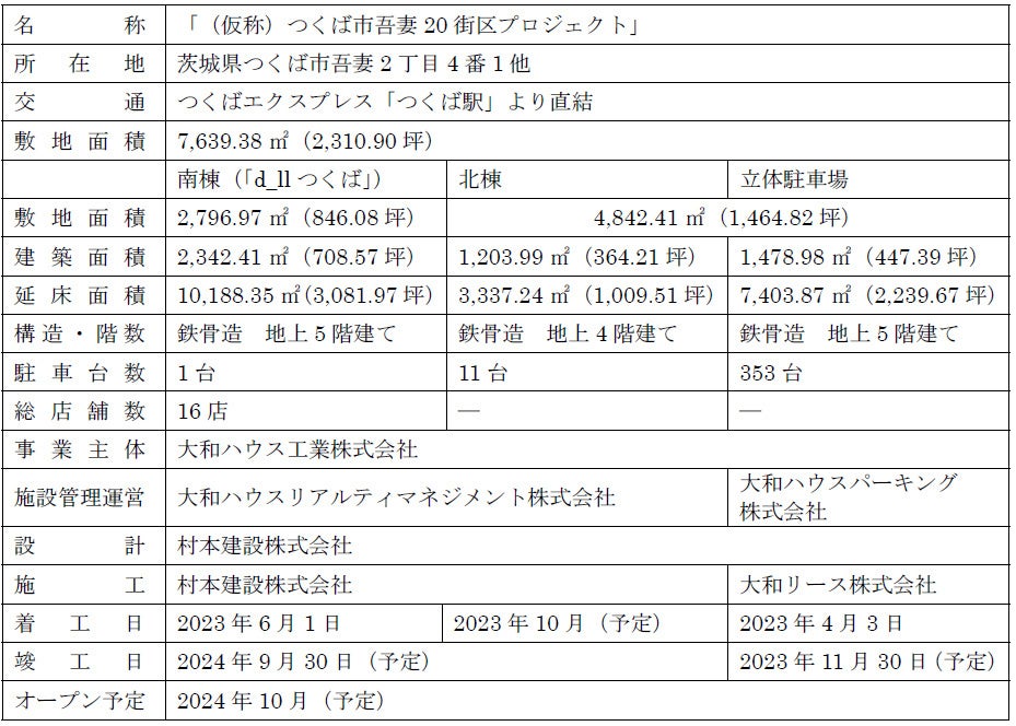 当プロジェクトは、南棟(用途:オフィス・店舗、建物名称:「d_ll(ディール)つくば」)、北棟(用途:オフィス(当社茨城支店・当社グループ会社入居予定))、立体駐車場の3棟からなる複合施設で、竣工は2024年9月を予定しています。