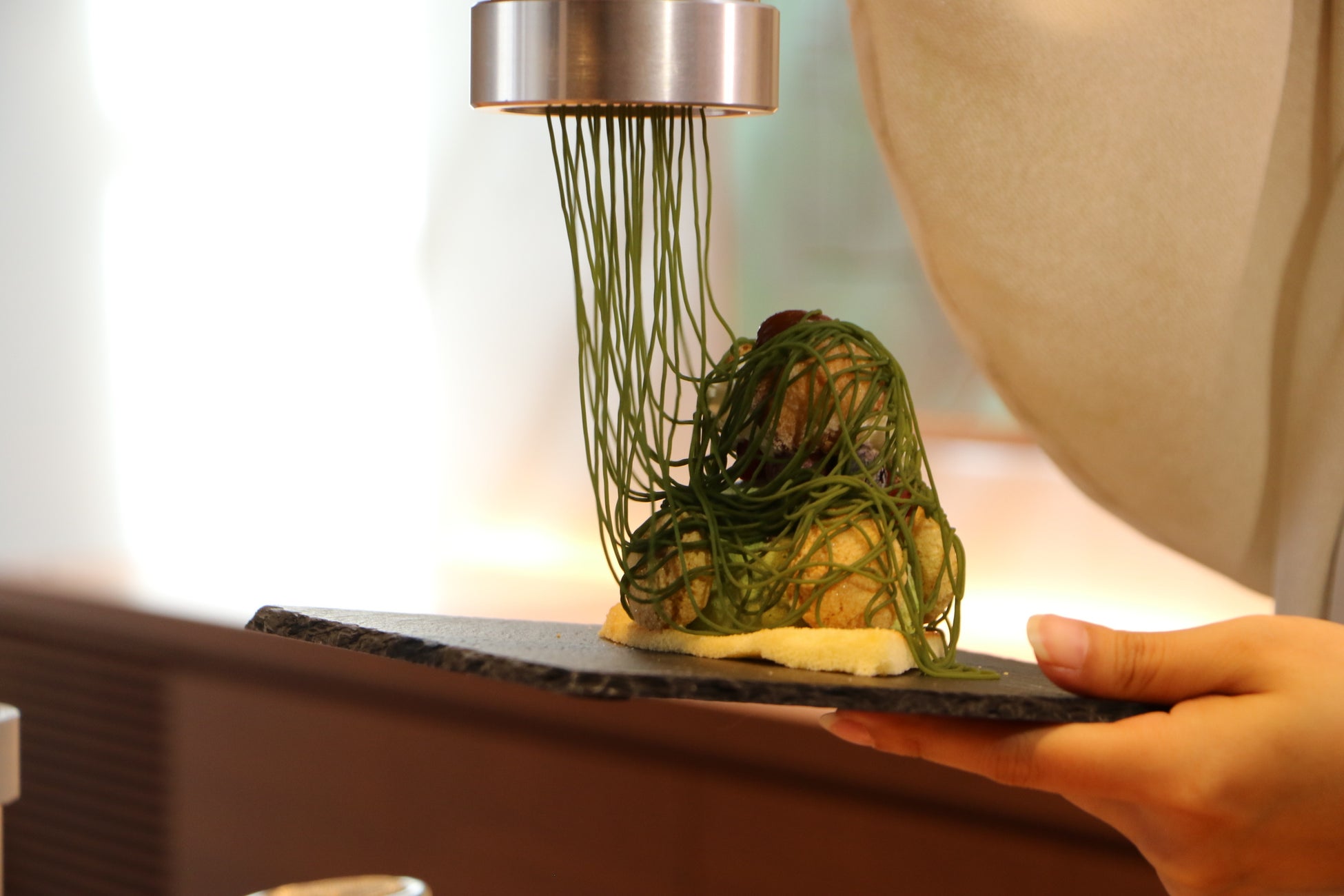 ≪串和菓子≫という見慣れない看板に惹かれて入ったのは、160年続く和菓子の老舗【伊藤軒】が新たに出したお店。本格的な上生菓子を手軽に食べられるテイクアウトスイーツとして販売しています。お店の奥にはカフェ室も併設しており、『串和菓子』とカフェ一番のオススメ『抹茶極細モンブラン山』をいただきます。