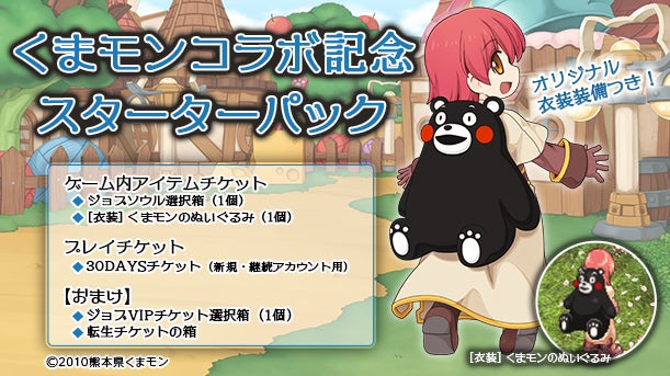 また、コラボ期間中、記念として「くまモンコラボ記念スターターパック」と「くまモンコラボ記念デラックスパック」を販売いたします。各パッケージにはオリジナル衣装装備のほか、『ラグナロクオンライン』が30日間遊べるプレイチケットやキャラクターの育成に役立つアイテムがついています。
