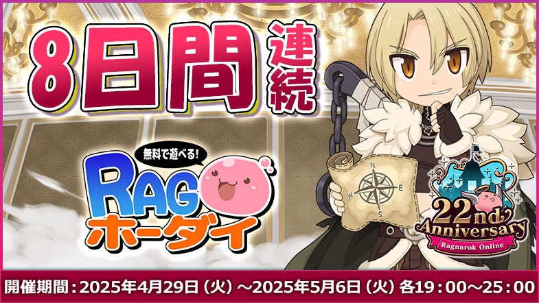 2025年4月29日(火)から8日間、プレイ利用権がなくても『ラグナロクオンライン』が遊べるRAGホーダイを開催いたします!みんなで集まって、『ラグナロクオンライン』を満喫してください!