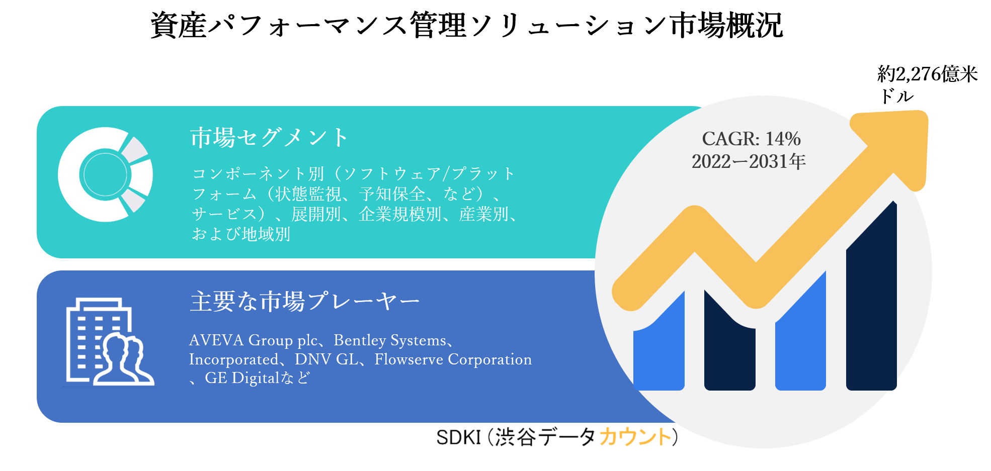 資産パフォーマンス管理ソリューション市場は、2022年に約798億米ドルの市場価値から、2031年までに約2,276億米ドルに達すると推定され、2022-2031年の予測期間中に14%のCAGRで成長すると予想されています。