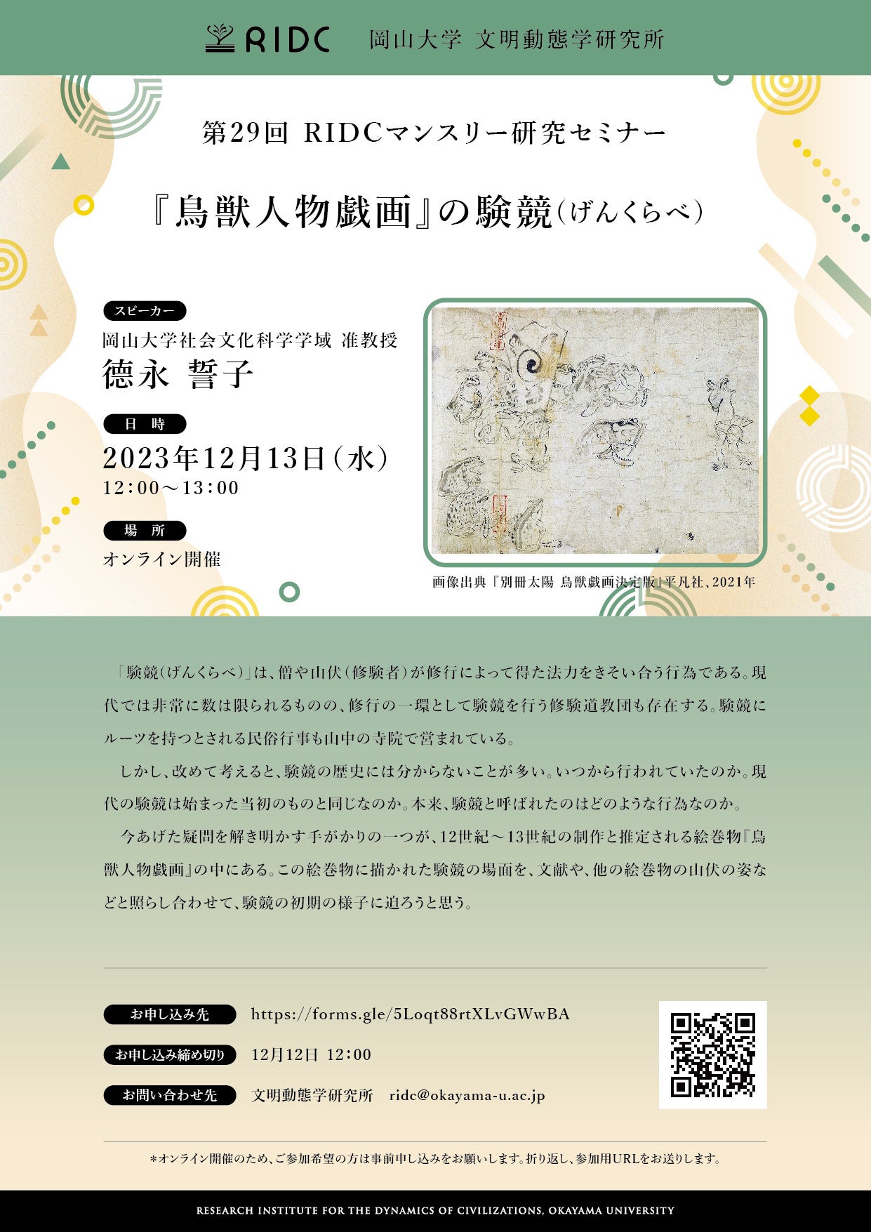 今回、2023年12月13日(水)にオンライン開催した第29回RIDCマンスリー研究セミナー「『鳥獣人物戯画』の験競(げんくらべ)」(スピーカー:岡山大学 学術研究院 社会文化科学学域 德永誓子 准教授)の録画配信を12月14日に開始しました。ぜひ皆様にご視聴頂けますと幸いです。