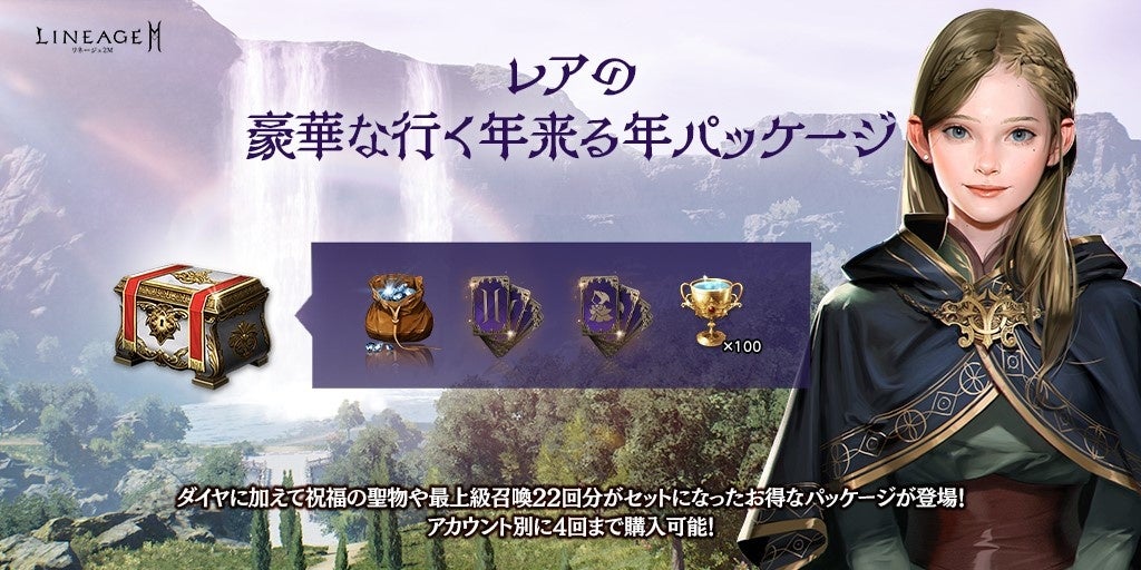 期間限定で、アカウント当たり4回購入ができる「レアの行く年来る年パッケージ」が登場しました。1,240ダイヤと「魔力の最上級クラス/アガシオン獲得券(11回)(刻印)」に加え、「祝福の聖物」100個が入ったお得なパッケージとなっています。