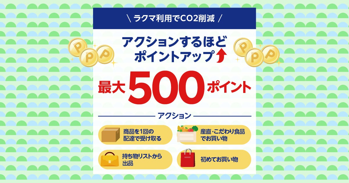 楽天グループ株式会社(以下「楽天」)が運営するフリマアプリ「楽天ラクマ」は、CO2削減を目指す取り組みとして、指定されたアクションを達成したユーザーに「楽天ポイント」最大500ポイント(注)を進呈するキャンペーンを本日開始しました。