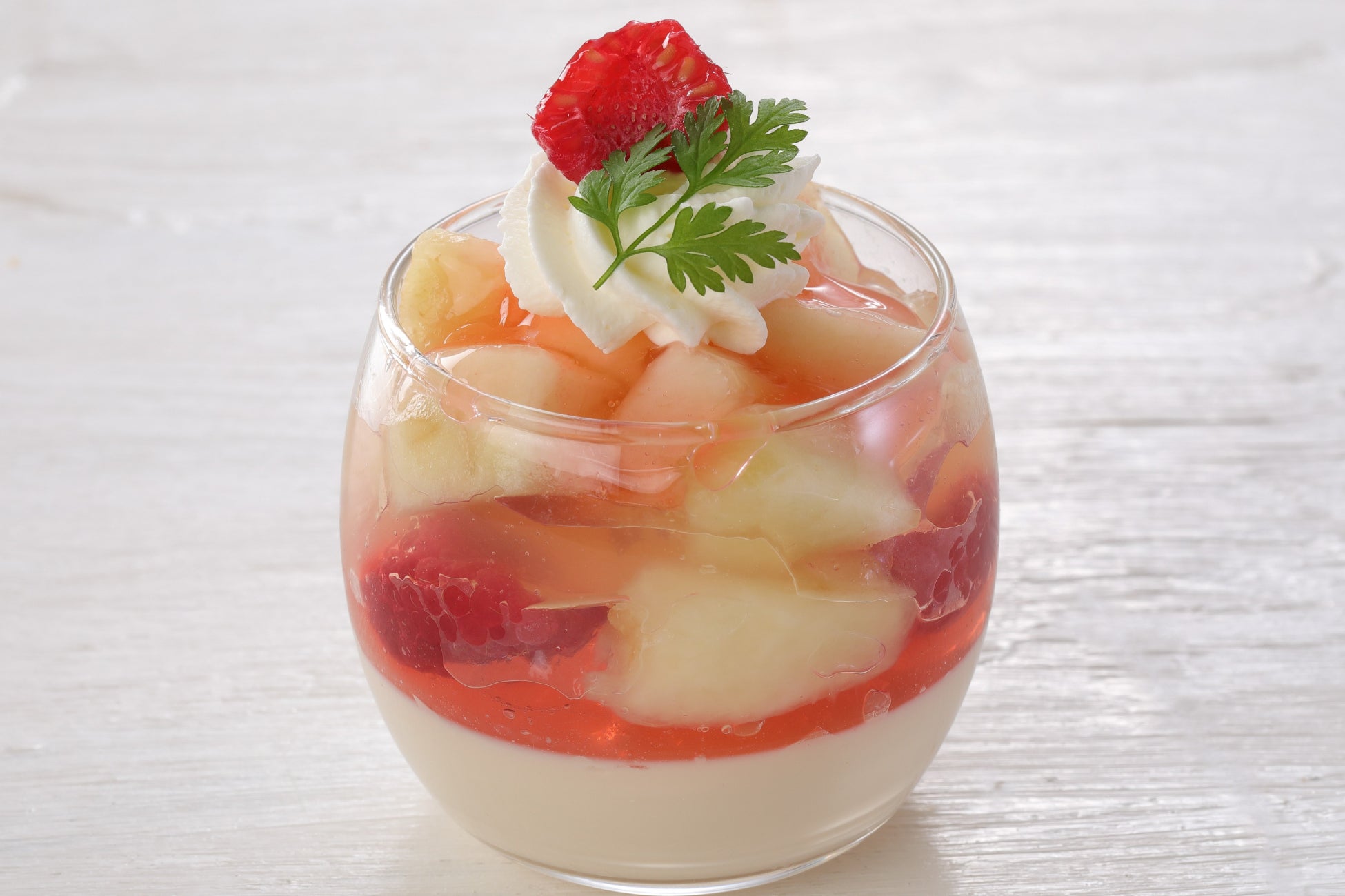 紅茶のパンナコッタに桃のコンポートとレモンのジュレを重ねた清涼感あふれるグラスデザートです。ふんだんに使用したジューシーな桃と紅茶の上品な香味をお楽しみください。