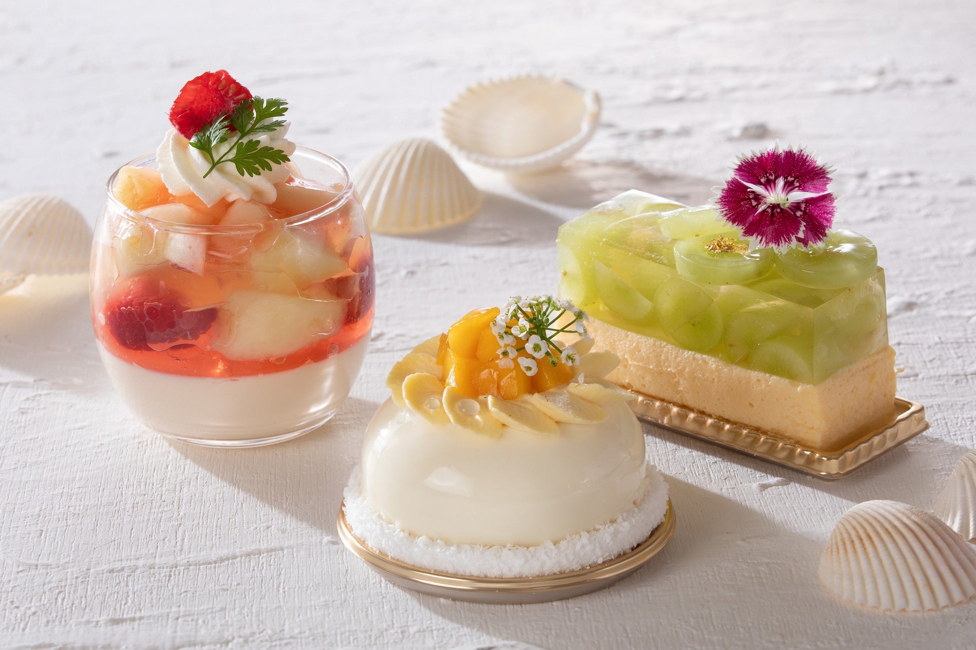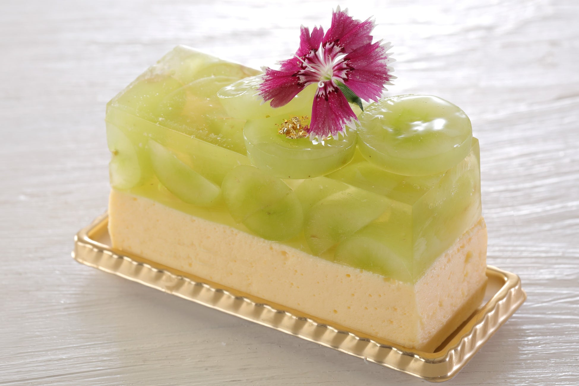 レアチーズケーキにマスカットをたっぷり入れたカルダモンフレーバーのゼリーを重ね、見た目も鮮やかに仕上げました。濃厚なレアチーズとマスカットのさわやかで上品な甘みが絶妙なバランスでお楽しみいただけます。