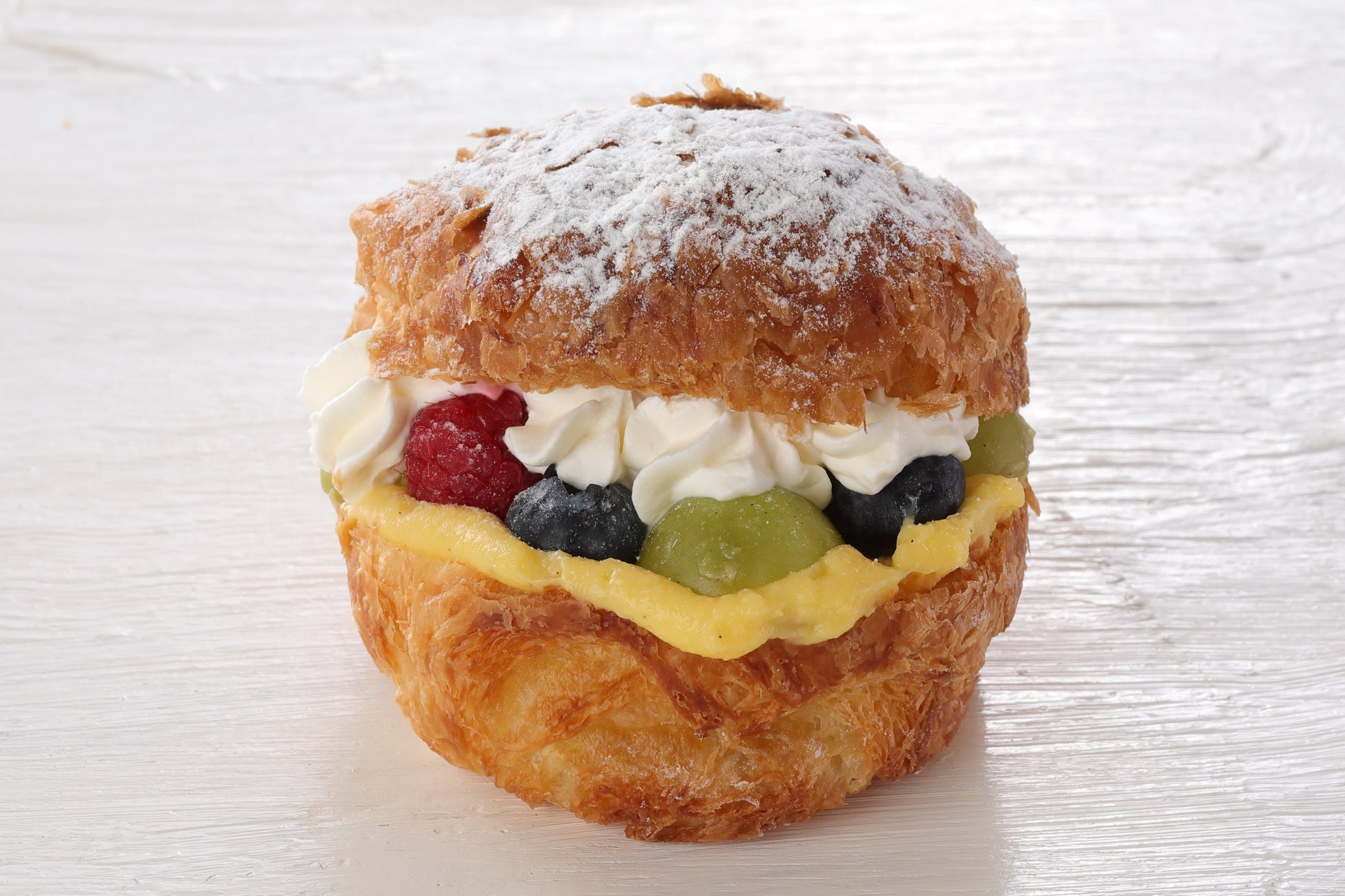 ボール状に焼き上げたデニッシュ生地に、カスタードクリームとヨーグルトクリームを絞り、マスカット、ブルーベリー、ラズベリーをサンドしました。ティータイムにおすすめの、シュークリームのようなデニッシュです。