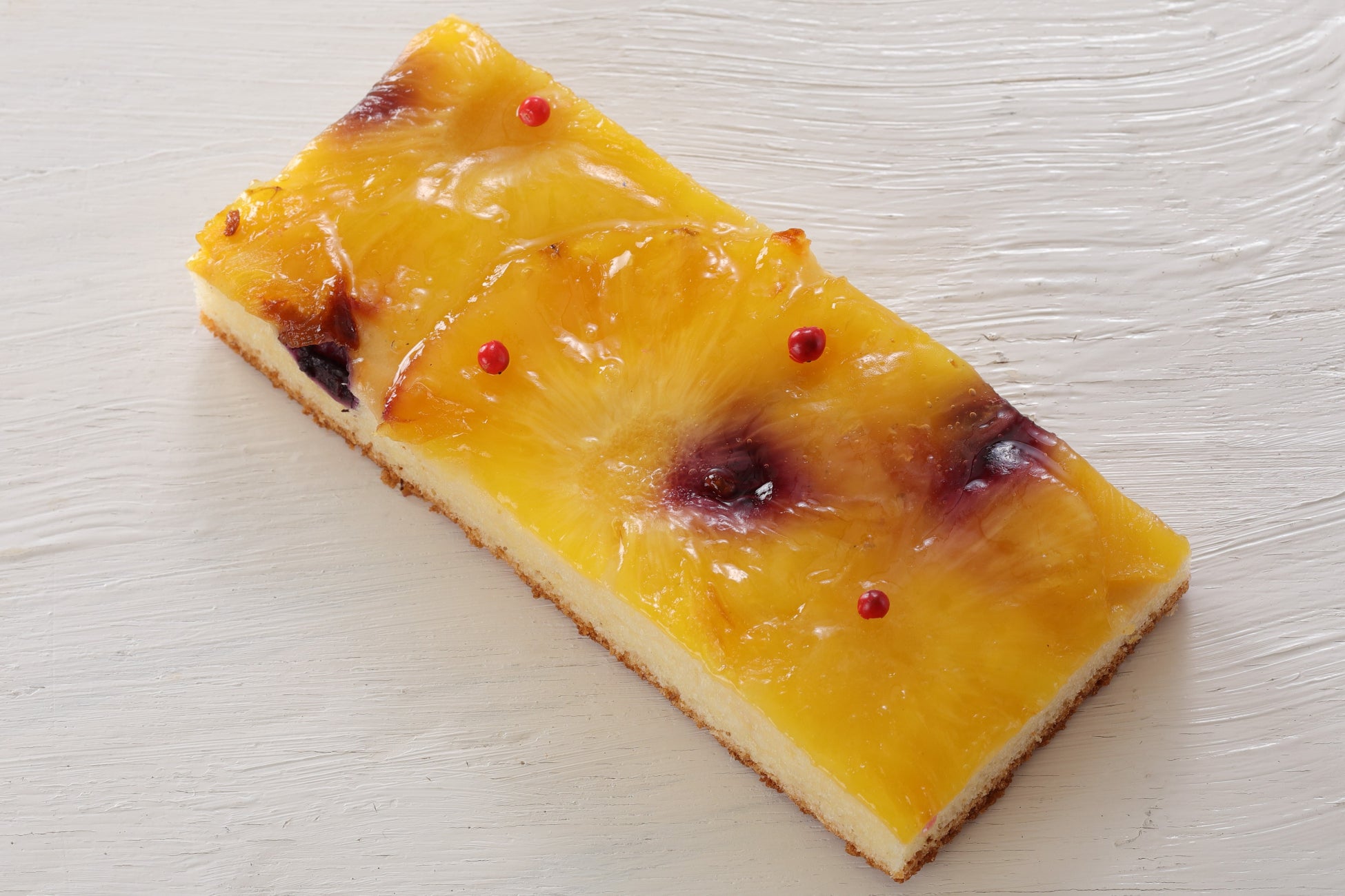 薄く伸ばしたブリオッシュ生地にチーズクリームを塗り、パイナップルやブルーベリーをトッピングし、焼き上げました。アクセントに加えたスパイシーなピンクペッパーが、パイナップルの甘みを引き締めます。