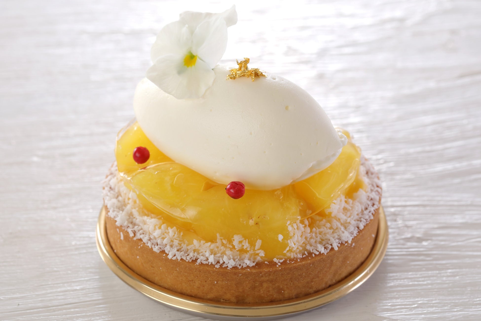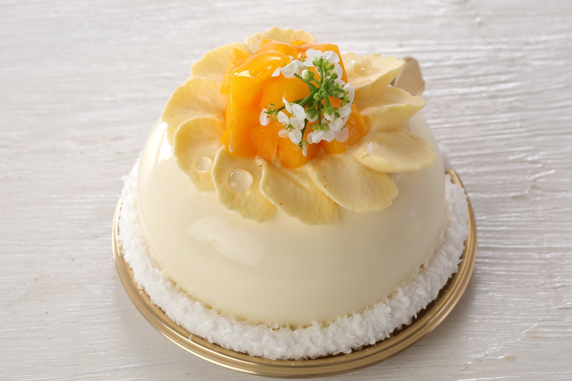 マンゴーのジュレとトロピカルフルーツのクリームをココナッツのムースで覆い、花びらをイメージしデコレーションしました。南国気分を味わえるエキゾチックなムースケーキです。