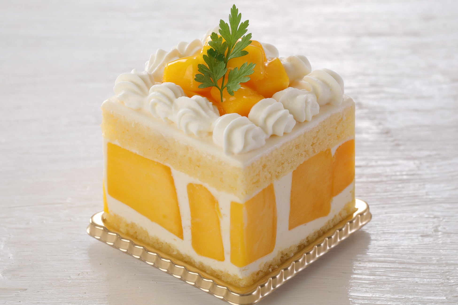 マンゴーとマンゴー風味の生クリームを、ふんわりと焼き上げたジェノワーズ生地でサンドしました。マンゴーのとろけるような食感と濃厚な甘みをご堪能いただける、毎年人気の商品です。