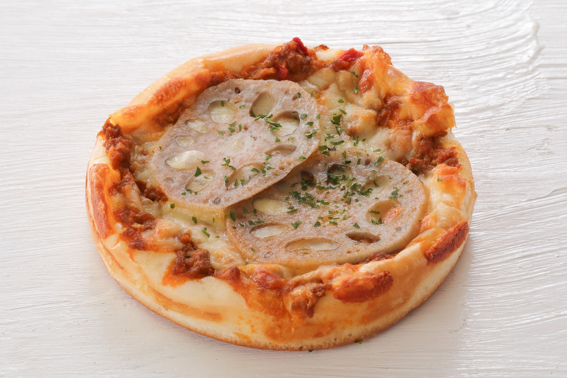 パン生地にキーマカレー、モッツァレラチーズ、蓮根のスライスをトッピングし、焼き上げました。蓮根のシャキシャキとした食感が楽しめる、夏におすすめのスパイシーな惣菜パンです。