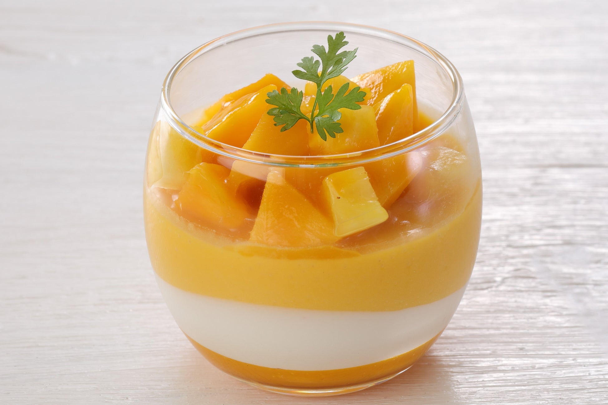 マンゴージュレ、ココナッツムース、マンゴームースを3層に重ね、マンゴーとパイナップルを飾り、パッションフルーツのソースを流しました。マンゴーの濃厚な甘みとココナッツの甘い香りにパッションフルーツのさわやかな酸味を加えた、トロピカルな味わいのグラスデザートです。
