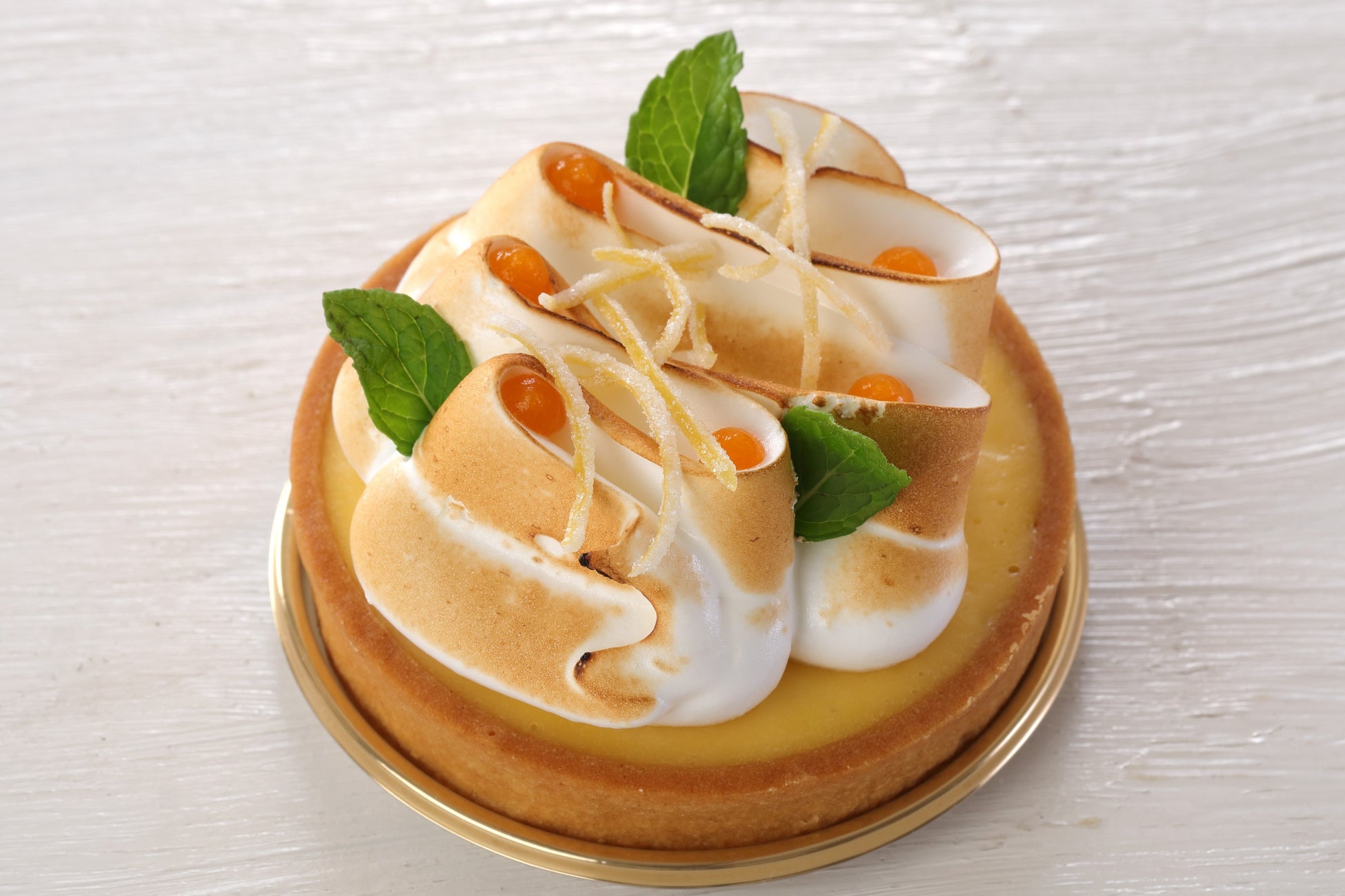 レモンクリームを詰めたタルトにメレンゲを絞り、アプリコットジャム、ミント、レモンピールのコンフィを飾りました。レモンの酸味にメレンゲの甘みをバランスよく加えた、さっぱりとお召し上がりいただけるタルトです。