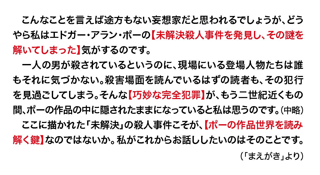 米文学史に名を刻む天才作家にして「推理小説の始祖」ポーは、なぜある時から突然、推理小説を書くのをやめたのか? 世界最高峰のミステリ賞〈エドガー賞〉(評論・評伝部門)で日本人初の最終候補、『謎ときサリンジャー』で小林秀雄賞を受賞した稀代の〈文学探偵〉による世紀の「発見」とは。作家解釈をも揺るがす震撼の論考。